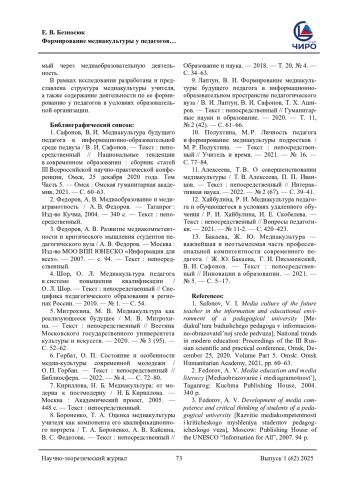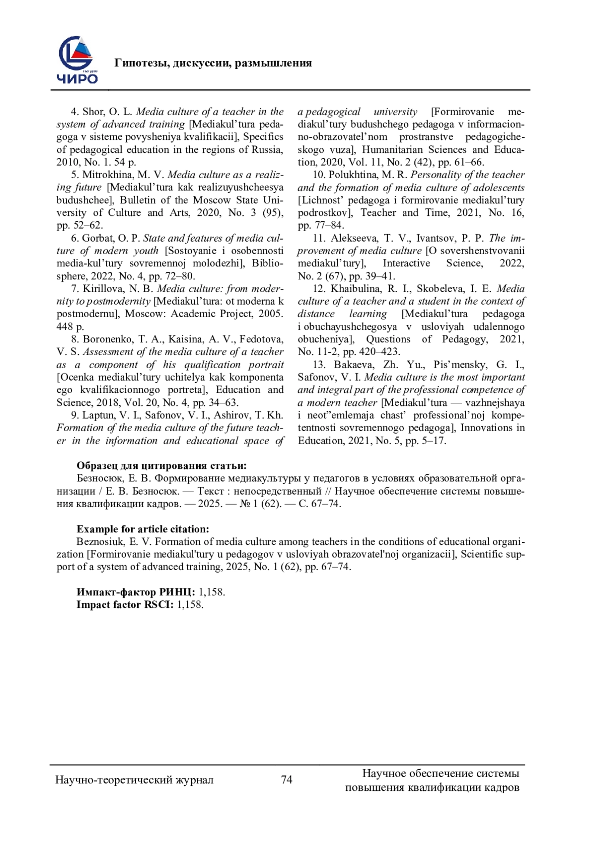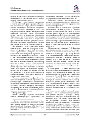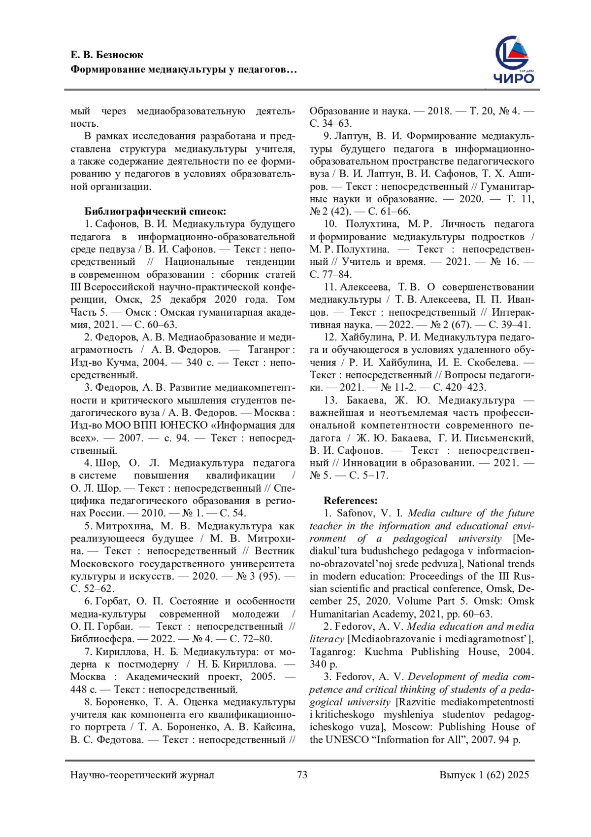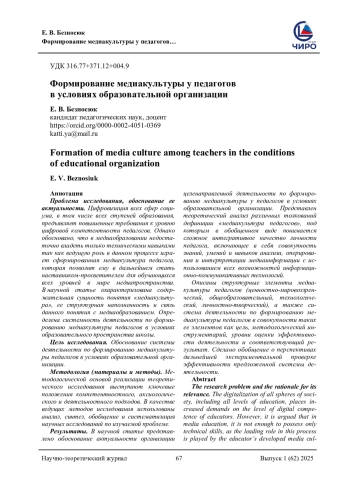 БЕЗНОСЮК Е. В. ФОРМИРОВАНИЕ МЕДИАКУЛЬТУРЫ У ПЕДАГОГОВ В УСЛОВИЯХ ОБРАЗОВАТЕЛЬНОЙ ОРГАНИЗАЦИИ // НАУЧНОЕ ОБЕСПЕЧЕНИЕ СИСТЕМЫ ПОВЫШЕНИЯ КВАЛИФИКАЦИИ КАДРОВ. 2025. № 1 (62) (14 СТ.)