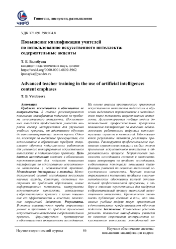 Проблема исследования и обоснование ее актуальности. В статье рассматривается повышение квалификации педагогов по проблеме искусственного интеллекта. Искусственный интеллект предоставляет учителям широкий спектр инструментов для улучшения учебного процесса, от адаптивного обучения до автоматизированных систем оценки. Однако, несмотря на очевидные преимущества, его использование в образовании требуют специального обучения педагогических работников для успешного интегрирования искусственного интеллекта в педагогическую практику. Цель данного исследования состоит в обосновании перспективности для педагогов повышения квалификации по использованию искусственного интеллекта в педагогической практике. Методология (материалы и методы). Методологической основой исследования послужили научные взгляды, концепции, системные построения по проблемам образования, новые информационные технологии, инструменты искусственного интеллекта, используемые в образовательном процессе с целью повышения его эффективности и качества, положения современной дидактики. Результаты. В статье анализируются труды современных ученых и практиков по проблеме применения искусственного интеллекта в образовательном процессе, формулируются противоречие и обосновывается актуальность исследования. На основе анализа практического применения искусственного интеллекта педагогами в обучении выделяются перспективные в методическом плане технологии искусственного интеллекта. Аргументируются учебные модули дополнительной профессиональной программы повышения квалификации по освоению педагогическими работниками цифровых интеллектуальных сервисов и технологий. Обосновываются результаты пилотной реализации программы. Ранжируется профессиональное оценивание слушателями сильных и слабых сторон применения искусственного интеллекта в образовательном процессе. Теоретическая значимость исследования состоит в систематизации литературы по проблеме исследования, в обосновании потенциала повышения квалификации учителей по освоению технологий искусственного интеллекта. Научная новизна отражается в постановке проблемы и научно-методическом обосновании целевой дополнительной профессиональной программы, в отборе и описании перспективных для внедрения в образовательный процесс технологий искусственного интеллекта. Практическая значимость публикации состоит в том, что описанные учебные модули могут применяться в дополнительном профессиональном обучении педагогов. Заключение. Установлена целесообразность повышения квалификации учителей по освоению современных инструментов искусственного интеллекта, методический потенциал которых открывает большое количество возможностей для формирования уникальной передовой образовательной практики, позволяющей обогатить традиционный учебный процесс и в полном масштабе реализовать концепцию персонализированного и адаптивного обучения в условиях цифровизации.