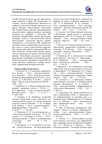 6. Соколов, Н. В. Искусственный интеллект и образование: анализ систем и технологий, применяемых в РФ / Н. В. Соколов, В. Г. Виноградский. - Текст: непосредственный // Образование и общество. - 2023. - № 1 (138). - С. 10-16. EDN: QRDOGA