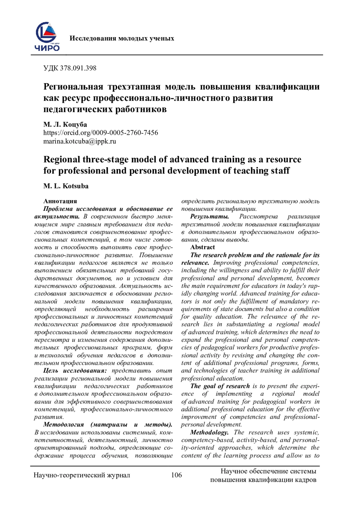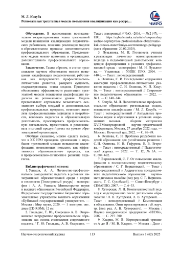 5. Коцуба, М. Л. Дополнительное профессиональное образование: региональная модель повышения квалификации / М. Л. Коцуба. - Текст: непосредственный // Актуальные проблемы науки и образования в условиях современных вызовов: сборник материалов XVII Международной научно-практической конференции, Москва, 27 декабря 2022 года. - Москва: Печатный цех, 2022. - С. 86-89. EDN: BOEARC