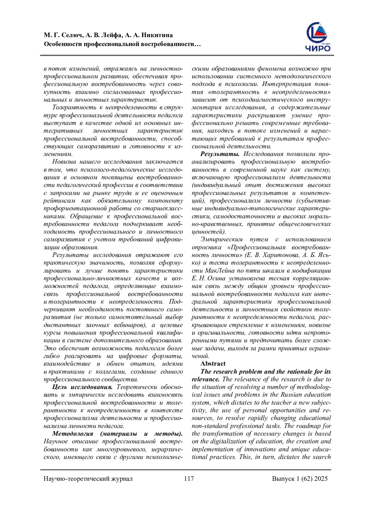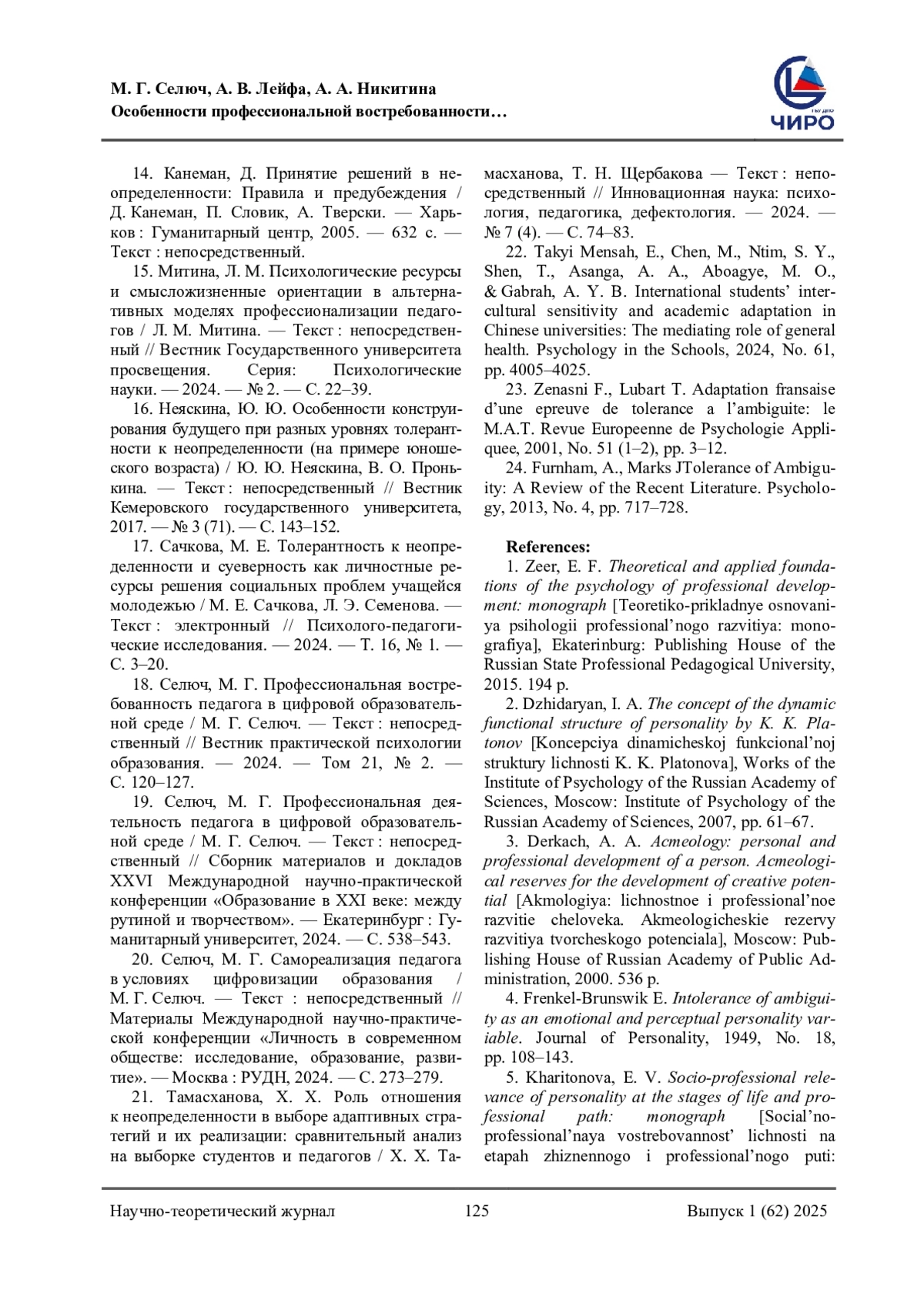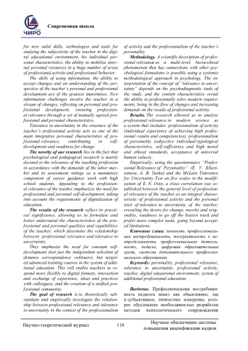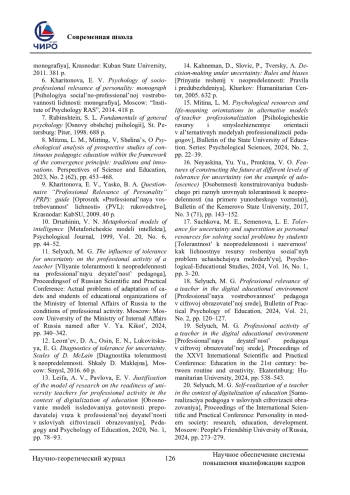 11. Селюч, М. Г. Влияние толерантности к неопределенности на профессиональную деятельность педагога / М. Г. Селюч. - Текст: непосредственный // Сборник научных трудов Всероссийской научно-практической конференции “Актуальные проблемы адаптации курсантов и слушателей образовательных организаций МВД России к условиям профессиональной деятельности”. - Москва: Московский университет МВД РФ им. В. Я. Кикотя, 2024. - С. 340-342. EDN: HMOLZR