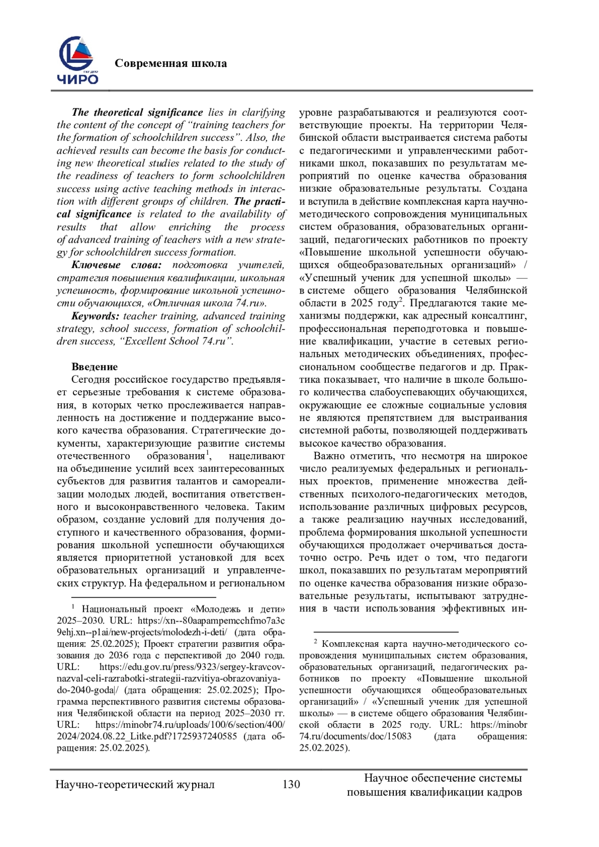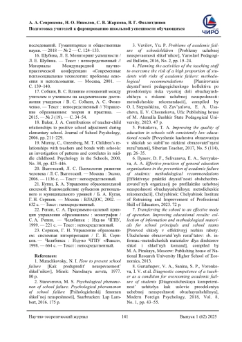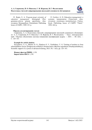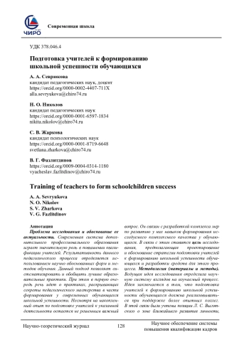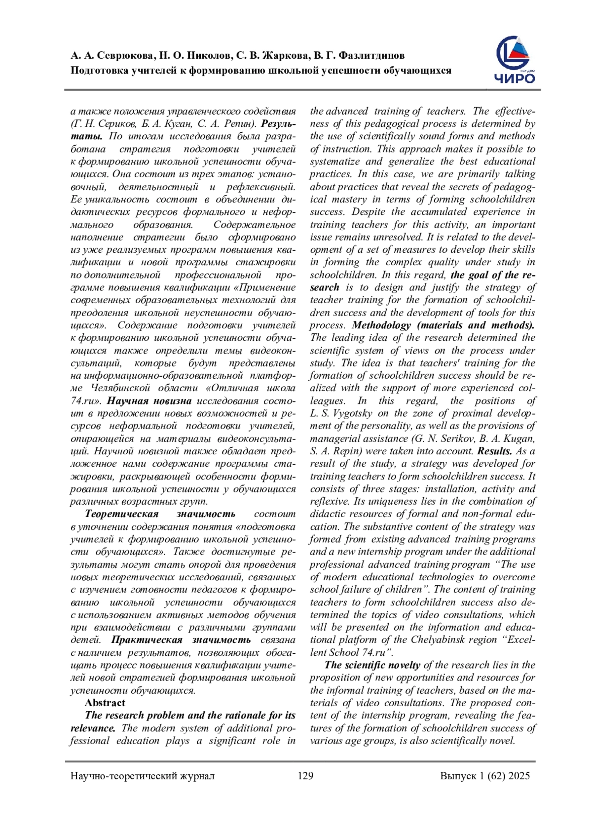 СЕВРЮКОВА А. А., НИКОЛОВ Н. О., ЖАРКОВА С. В., ФАЗЛИТДИНОВ В.Г. ПОДГОТОВКА УЧИТЕЛЕЙ К ФОРМИРОВАНИЮ ШКОЛЬНОЙ УСПЕШНОСТИ ОБУЧАЮЩИХСЯ // НАУЧНОЕ ОБЕСПЕЧЕНИЕ СИСТЕМЫ ПОВЫШЕНИЯ КВАЛИФИКАЦИИ КАДРОВ. 2025. № 1 (62) (14 СТ.)
