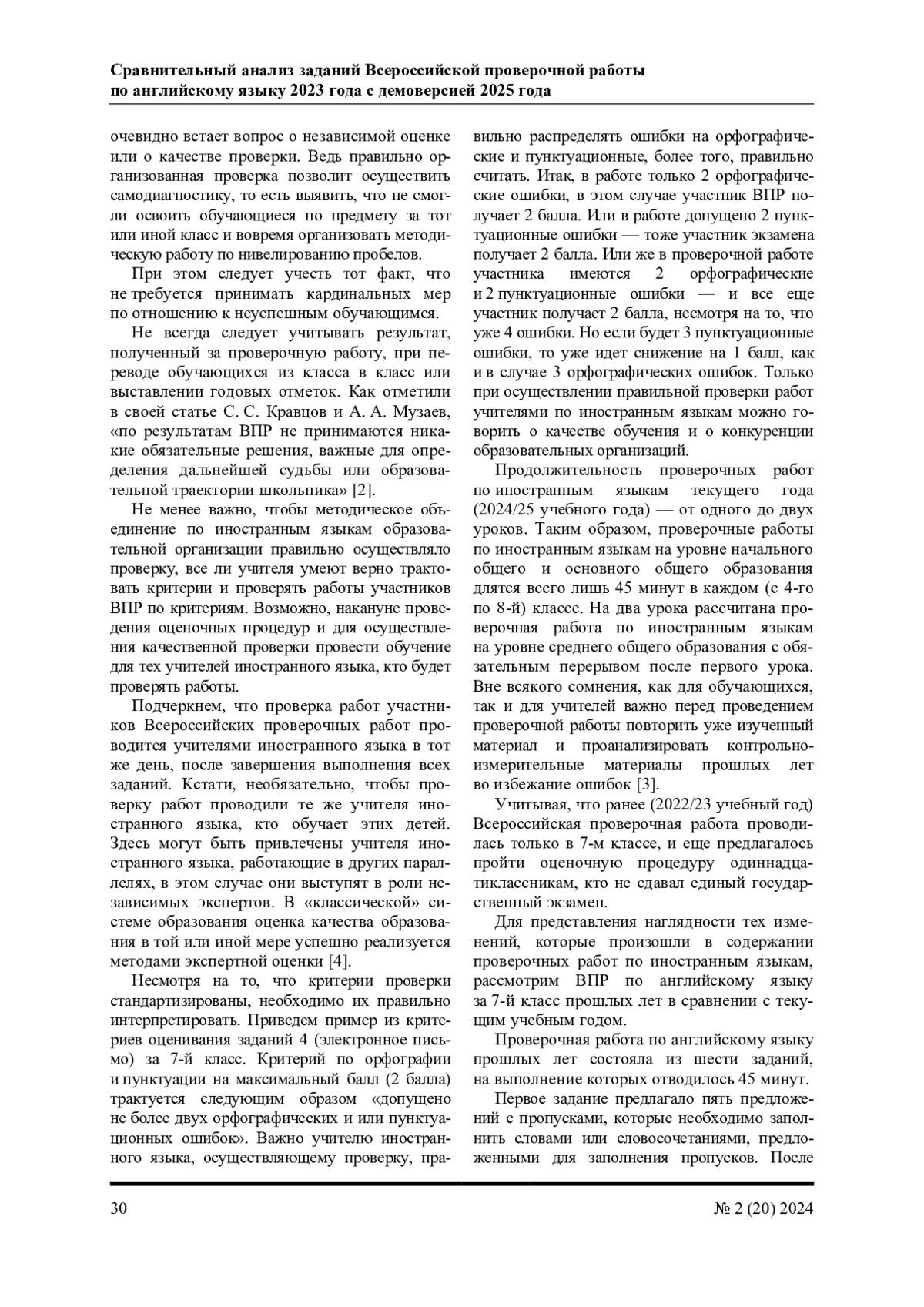 2. Кравцов, С. С. Роль Всероссийских проверочных работ в системе контроля качества образования в Российской Федерации / С. С. Кравцов, А. А. Музаев // Отечественная и зарубежная педагогика. - 2017. - Т. 1, № 5 (43). - С. 96-111. EDN: ZRCFBT