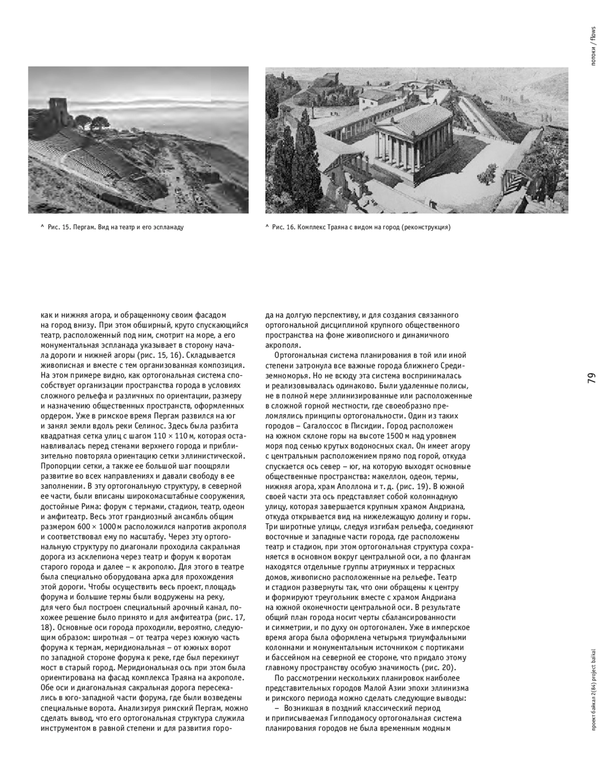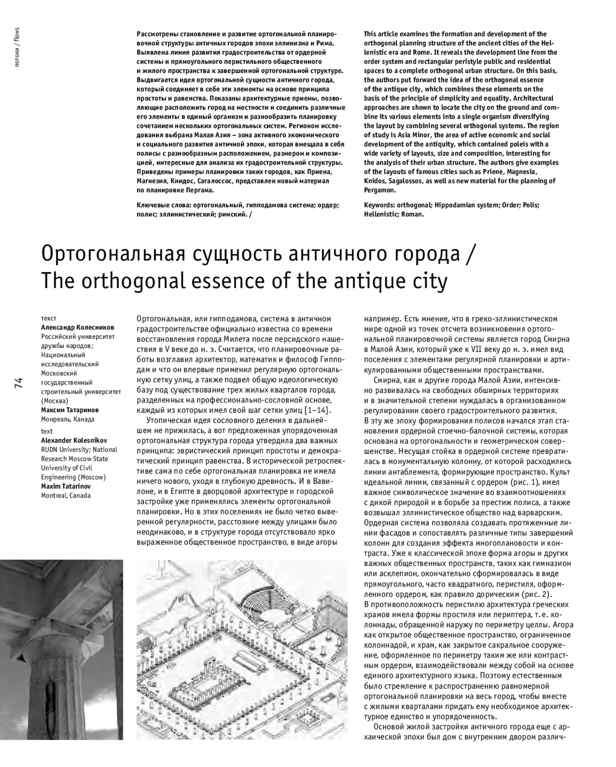 Рассмотрены становление и развитие ортогональной планировочной структуры античных городов эпохи эллинизма и Рима. Выявлена линия развития градостроительства от ордерной системы и прямоугольного перистильного общественного и жилого пространства к завершенной ортогональной структуре. Выдвигается идея ортогональной сущности античного города, который соединяет в себе эти элементы на основе принципа простоты и равенства. Показаны архитектурные приемы, позволяющие расположить город на местности и соединить различные его элементы в единый организм и разнообразить планировку сочетанием нескольких ортогональных систем. Регионом исследования выбрана Малая Азия - зона активного экономического и социального развития античной эпохи, которая вмещала в себя полисы с разнообразным расположением, размером и композицией, интересные для анализа их градостроительной структуры. Приведены примеры планировки таких городов, как Приена, Магнезия, Книдос, Сагалоссос, представлен новый материал по планировке Пергама.