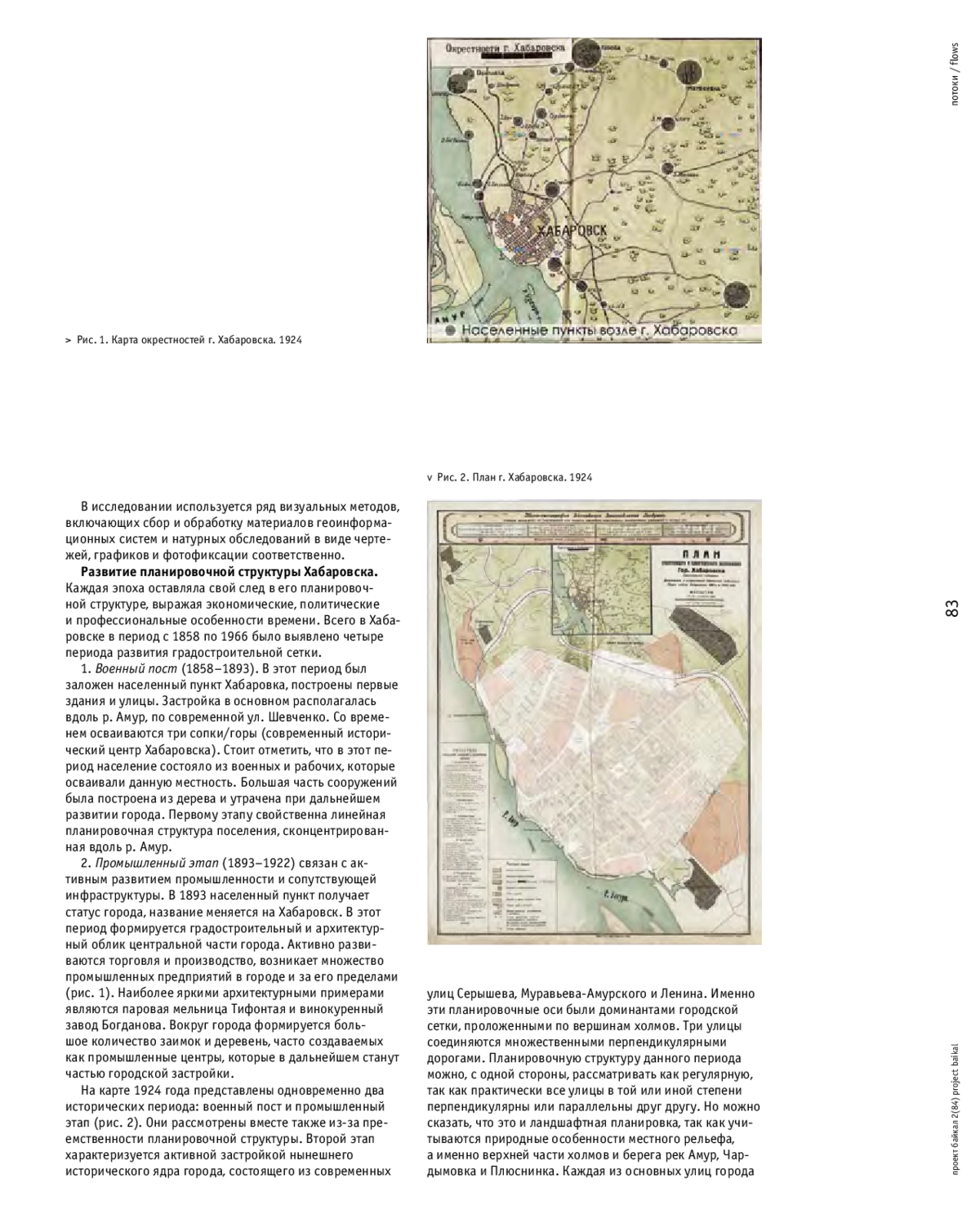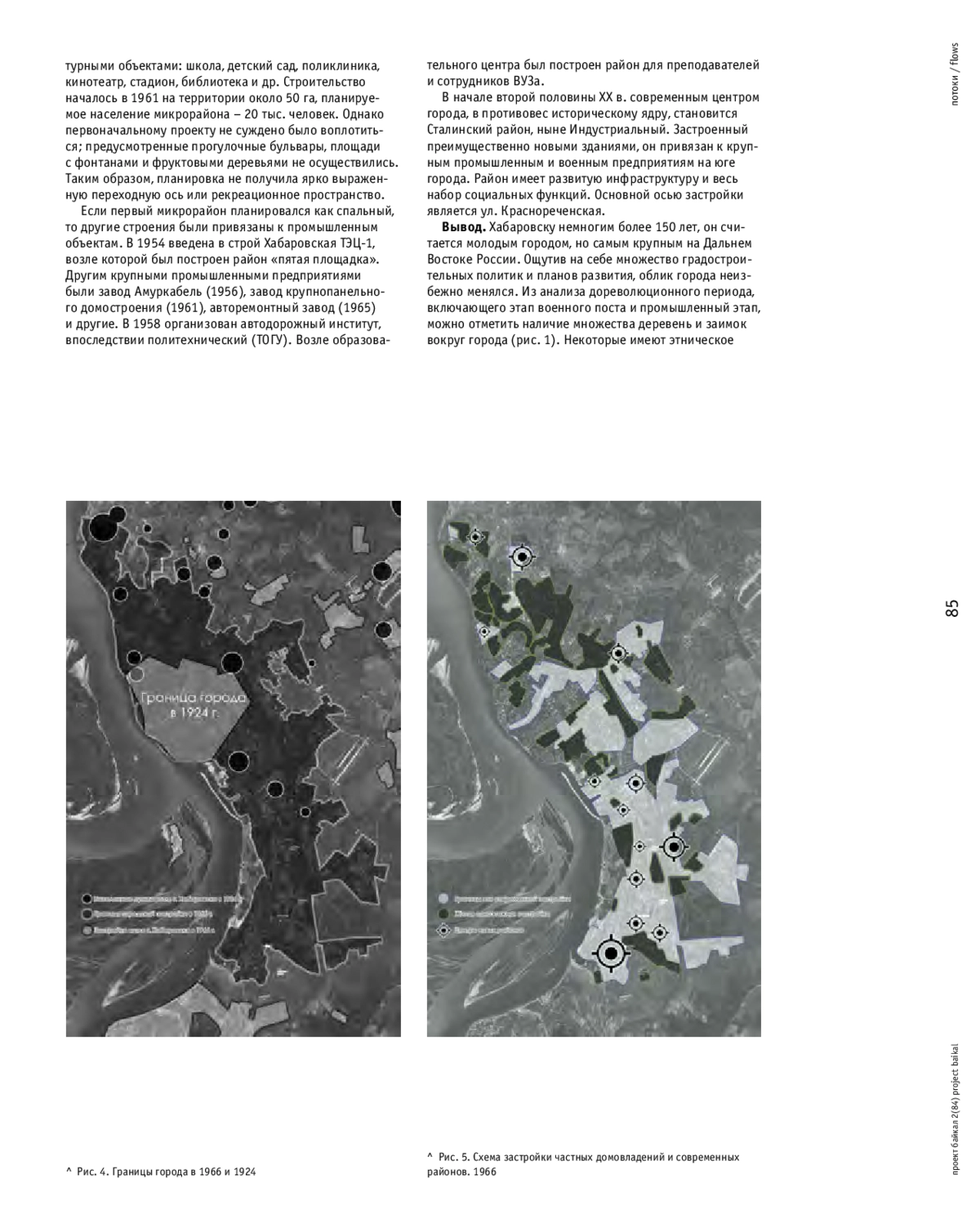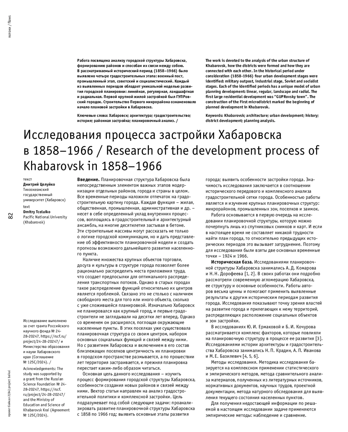 Введение. Планировочная структура Хабаровска была непосредственным элементом важных этапов модернизации отдельных районов, города и страны в целом. Все временные периоды наложили отпечаток на градостроительную картину города. Каждая функция – жилая, общественная, промышленная, административная и др. – несет в себе определенный уклад внутренних процессов, воплощаясь в градостроительный и архитектурный ансамбль, на многие десятилетия застывая в бетоне. Эти строительные массивы могут рассказать не только о логике городской коммуникации, но и дать представление об эффективности планировочной модели и создать прогнозы возможного дальнейшего развития населенного пункта.