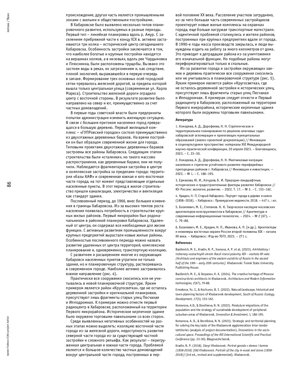 3. Ермакова, Ю. И., Кочуров, Б. И. Природно-ландшафтные, исторические и градостроительные факторы развития Хабаровска // Юг России: экология, развитие. - 2022. Т. 17. - № 3. - C. 153-162.