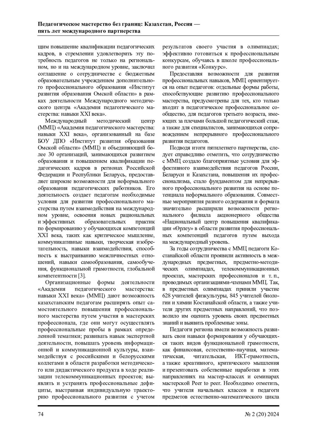 Международный методический центр (ММЦ) «Академия педагогического мастерства: навыки XXI века», организованный на базе БОУ ДПО «Институт развития образования Омской области» (ММЦ) и объединяющий более 30 организаций, занимающихся развитием образования и повышением квалификации педагогических кадров в регионах Российской Федерации и Республики Беларусь, предоставляет широкие возможности для неформального образования педагогических работников. Его деятельность создает педагогам необходимые условия для развития профессионального мастерства путем взаимодействия на международном уровне, освоения новых рациональных и эффективных образовательных практик по формированию у обучающихся компетенций XXI века, таких как критическое мышление, коммуникативные навыки, творческая изобретательность, навыки взаимодействия, способность к выстраиванию межличностных отношений, навыки самообразования, самообучения, функциональной грамотности, глобальной компетентности [3].