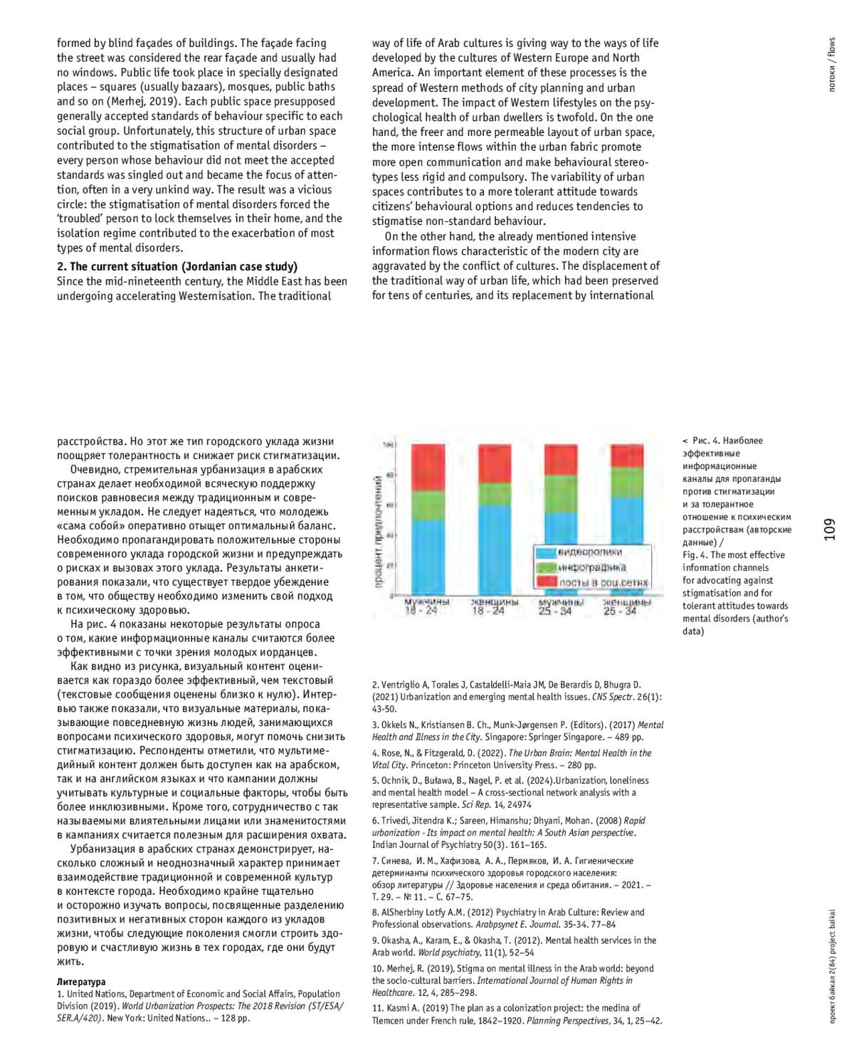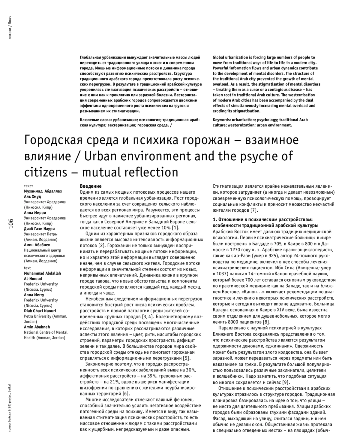 Глобальная урбанизация вынуждает значительные массы людей переходить от традиционного уклада к жизни в современном городе. Мощные информационные потоки и динамика города способствуют развитию психических расстройств. Структура традиционного арабского города препятствовала росту психических перегрузок. В результате в традиционной арабской культуре укоренилась стигматизация психических расстройств - отношение к ним как к проклятию или заразной болезни. Вестернизация современных арабских городов сопровождается двоякими эффектами одновременного роста психических нагрузок и размыванием их стигматизации.