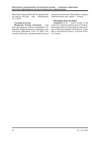 . Иванычева, Т. А. Организация работы регионального методического актива: презентация. - URL: https://togirro.ru/assets/files/2023/cnppm/ivanycheva_ta_org_raboty_metaktiva.pdf(дата обращения: 18.11.2023).