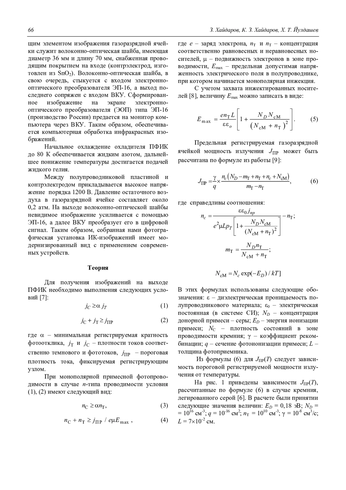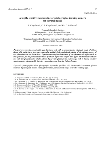 ХАЙДАРОВ З., ХАЙДАРОВА К. З., ЙУЛДАШЕВ Х. Т. ВЫСОКОЧУВСТВИТЕЛЬНАЯ ПОЛУПРОВОДНИКОВАЯ ИОНИЗАЦИОННАЯ ФОТОГРАФИЧЕСКАЯ КАМЕРА ДЛЯ ИНФРАКРАСНОГО ДИАПАЗОНА // ПРИКЛАДНАЯ ФИЗИКА. 2017. №1