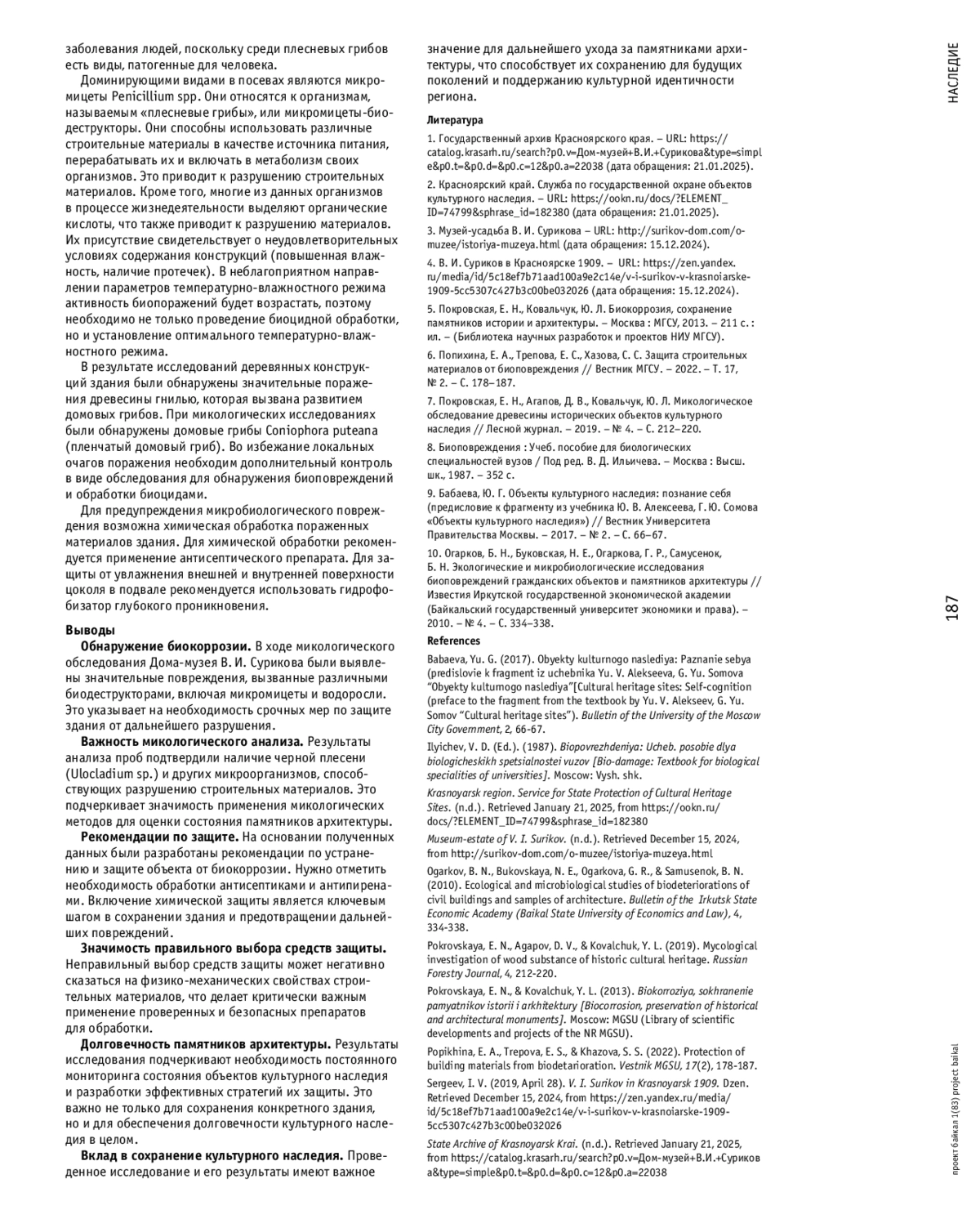 ЗВОНАРЕВА П. ДОМ-МУЗЕЙ В. И. СУРИКОВА: МИКОЛОГИЧЕСКОЕ ОБСЛЕДОВАНИЕ // ПРОЕКТ БАЙКАЛ. 2025. № 84, ТОМ 22