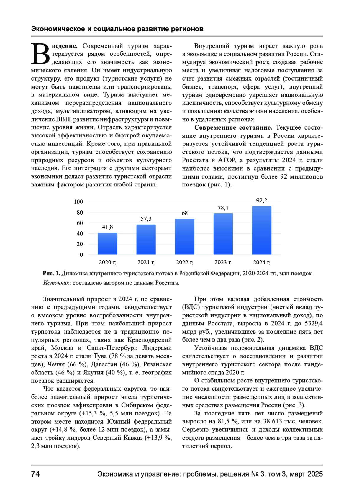 Внутренний туризм является приоритетным направлением развития туризма в России. Статья посвящена анализу текущего состояния внутреннего туризма в России, исследованию существующих тенденций, определению проблем и оценке перспектив развития. В статье рассмотрены факторы, влияющие на популярность различных туристических направлений, проанализирована инфраструктура туристической отрасли, оценена роль государства в развитии внутреннего туризма, а также определены перспективы роста и необходимые меры для повышения его конкурентоспособности.