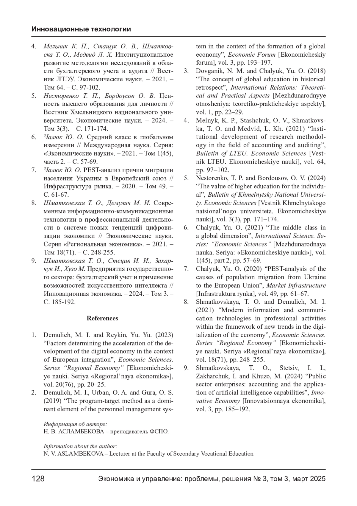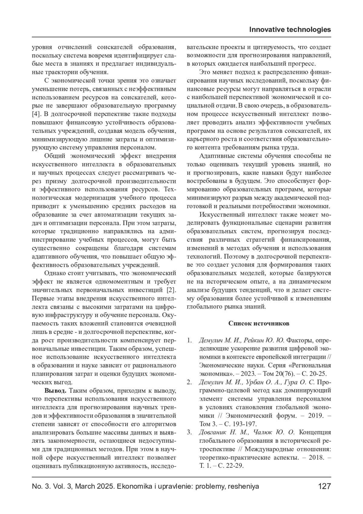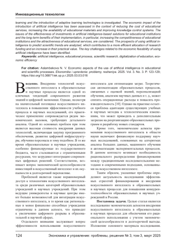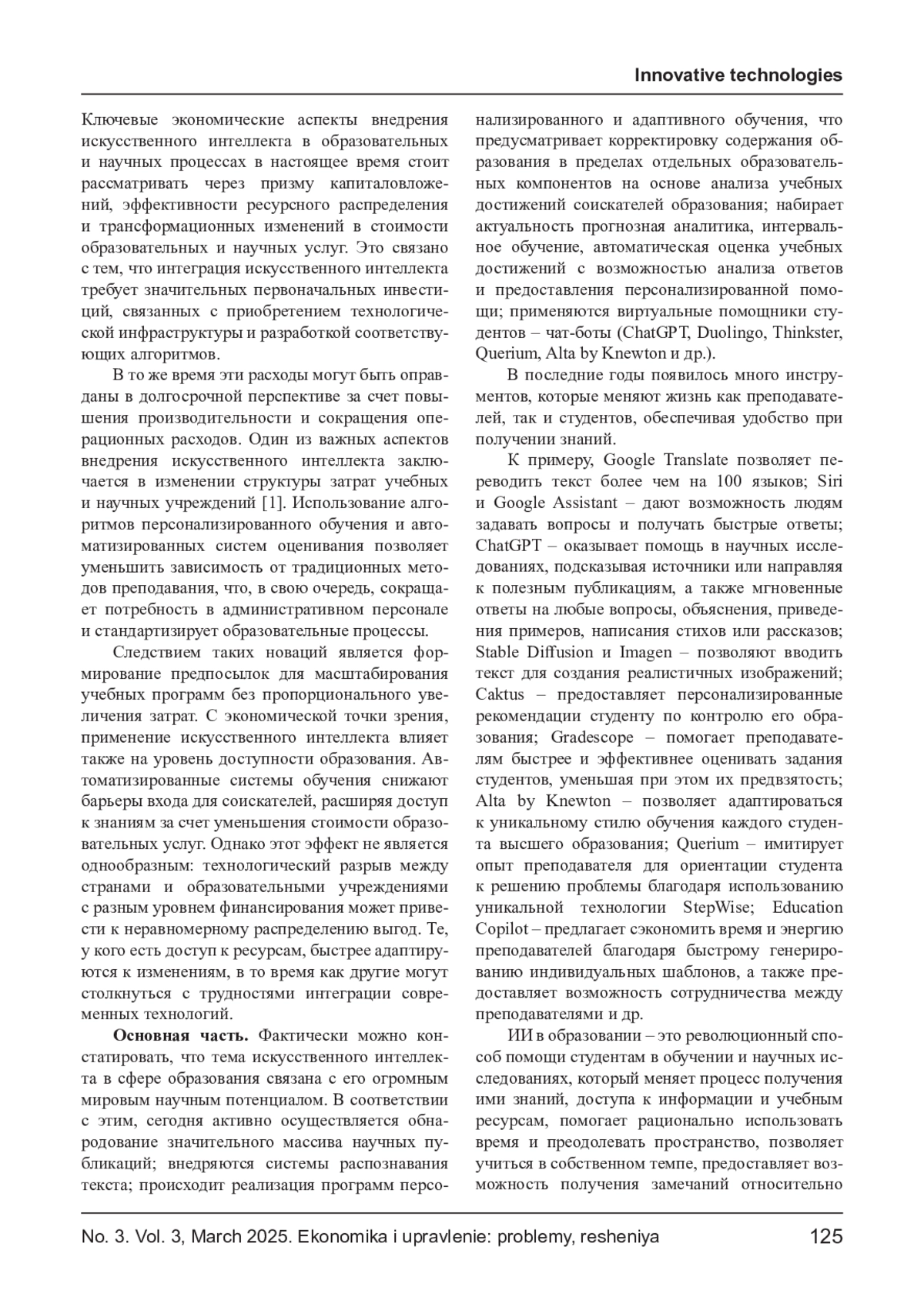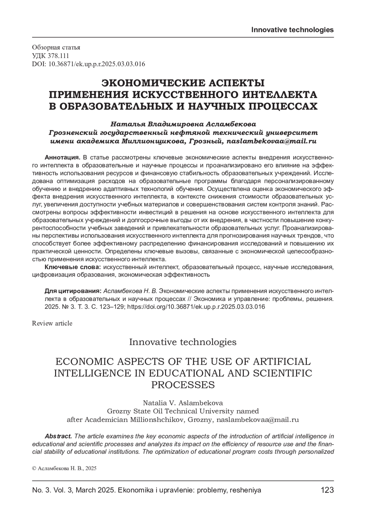 АСЛАМБЕКОВА Н. В. ЭКОНОМИЧЕСКИЕ АСПЕКТЫ ПРИМЕНЕНИЯ ИСКУССТВЕННОГО ИНТЕЛЛЕКТА В ОБРАЗОВАТЕЛЬНЫХ И НАУЧНЫХ ПРОЦЕССАХ // ЭКОНОМИКА И УПРАВЛЕНИЕ: ПРОБЛЕМЫ, РЕШЕНИЯ. 2025. ТОМ 3 № 3