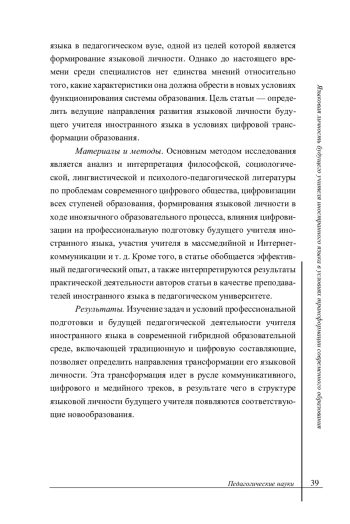 Введение. Цифровая трансформация всех областей жизни современного общества не обошла стороной и сферу образования: в настоящее время идет масштабное переформатирование высшей школы на базе развития цифровых технологий. Это касается, в том числе, профессиональной подготовки учителя иностранного языка в педагогическом вузе, одной из целей которой является формирование языковой личности. Однако до настоящего времени среди специалистов нет единства мнений относительно того, какие характеристики она должна обрести в новых условиях функционирования системы образования. Цель статьи - определить ведущие направления развития языковой личности будущего учителя иностранного языка в условиях цифровой трансформации образования.