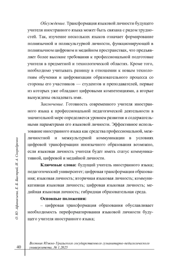 Результаты. Изучение задач и условий профессиональной подготовки и будущей педагогической деятельности учителя иностранного языка в современной гибридной образовательной среде, включающей традиционную и цифровую составляющие, позволяет определить направления трансформации его языковой личности. Эта трансформация идет в русле коммуникативного, цифрового и медийного треков, в результате чего в структуре языковой личности будущего учителя появляются соответствующие новообразования. Обсуждение. Трансформация языковой личности будущего учителя иностранного языка может быть связана с рядом трудностей. Так, изучение нескольких языков означает формирование полиязычной и поликультурной личности, функционирующей в полиязычном цифровом и медийном пространствах, что предъявляет более высокие требования к профессиональной подготовке учителя в предметной и технологической областях. Кроме того, необходимо учитывать разницу в отношении к новым технологиям обучения и цифровизации образовательного процесса со стороны его участников - студентов и преподавателей, первые из которых уже обладают цифровыми компетенциями, а вторые вынуждены овладевать ими.