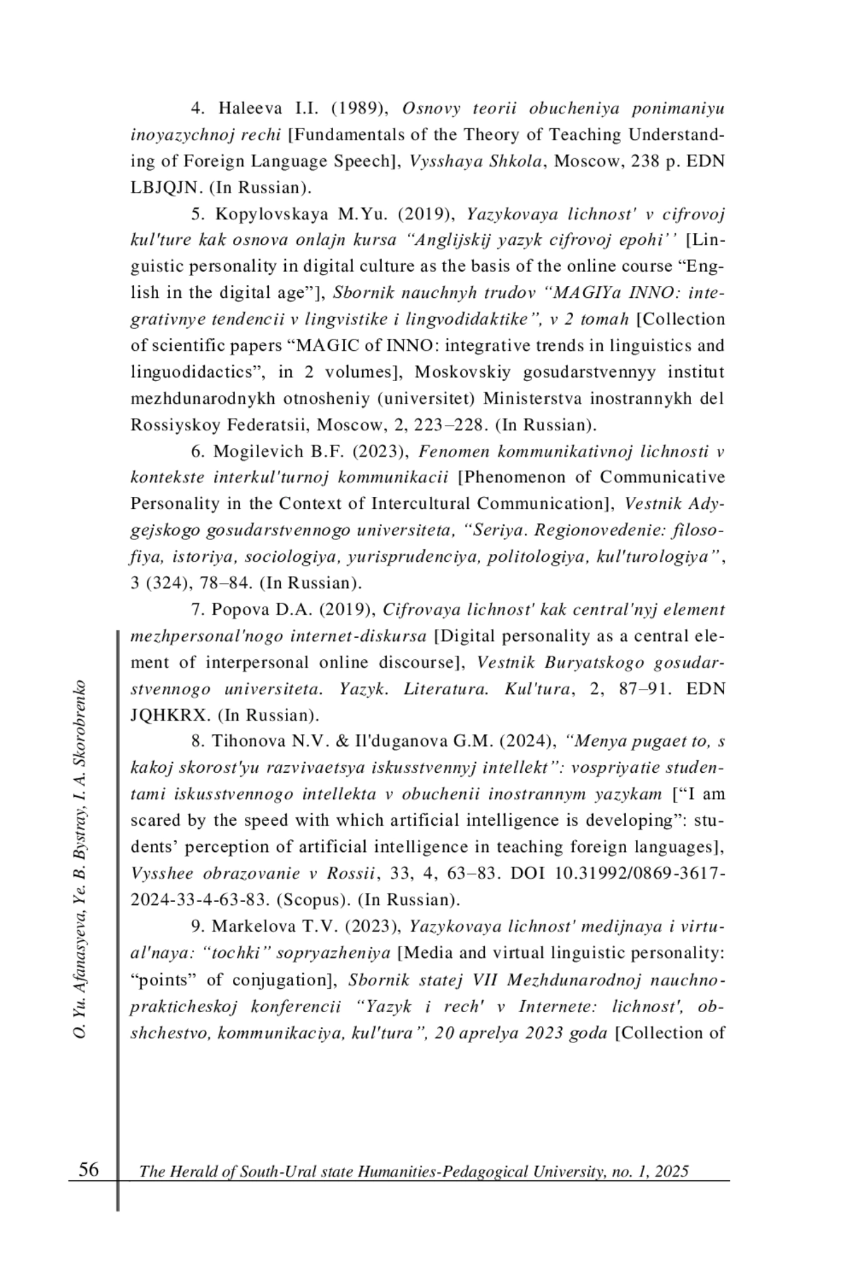 10. Бочарова М. Н. Формирование новой языковой личности при обучении иностранному языку в неязыковом вузе в условиях цифровизации: смена мотивационных триггеров // Филологические науки. Вопросы теории и практики. 2024. Т. 17, № 2. С. 635-640. DOI: 10.30853/phil20240091 EDN: BKJTOJ