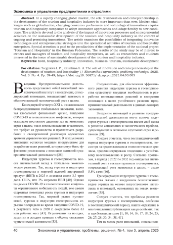 В условиях стремительно меняющегося мирового рынка роль инноваций и предпринимательства в развитии туризма и индустрии гостеприимства становится как никогда актуальной. Современные вызовы, такие как глобализация, изменение потребительских предпочтений и технологические новшества, требуют от предприятий отрасли туризма и гостеприимства внедрения новаторских подходов и гибкой адаптации к новым условиям. Статья посвящена анализу влияния инновационных процессов и предпринимательской активности на устойчивое развитие индустрии туризма и гостеприимства в контексте внедряемых и перспективных инноваций. В статье рассматриваются возможности интеграции инновационных технологий и предпринимательских стратегий в операционную деятельность предприятий отрасли туризма и гостеприимства. Особое внимание уделено специфике реализации в Российской Федерации национального проекта «Туризм и индустрия гостеприимства». Результаты исследования могут быть интересны владельцам и менеджерам предприятий индустрии туризма и гостеприимства, а также исследователям и студентов, интересующимся темой устойчивого развития отрасли туризма и гостеприимства.