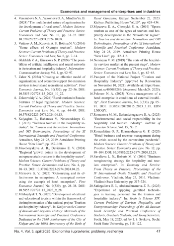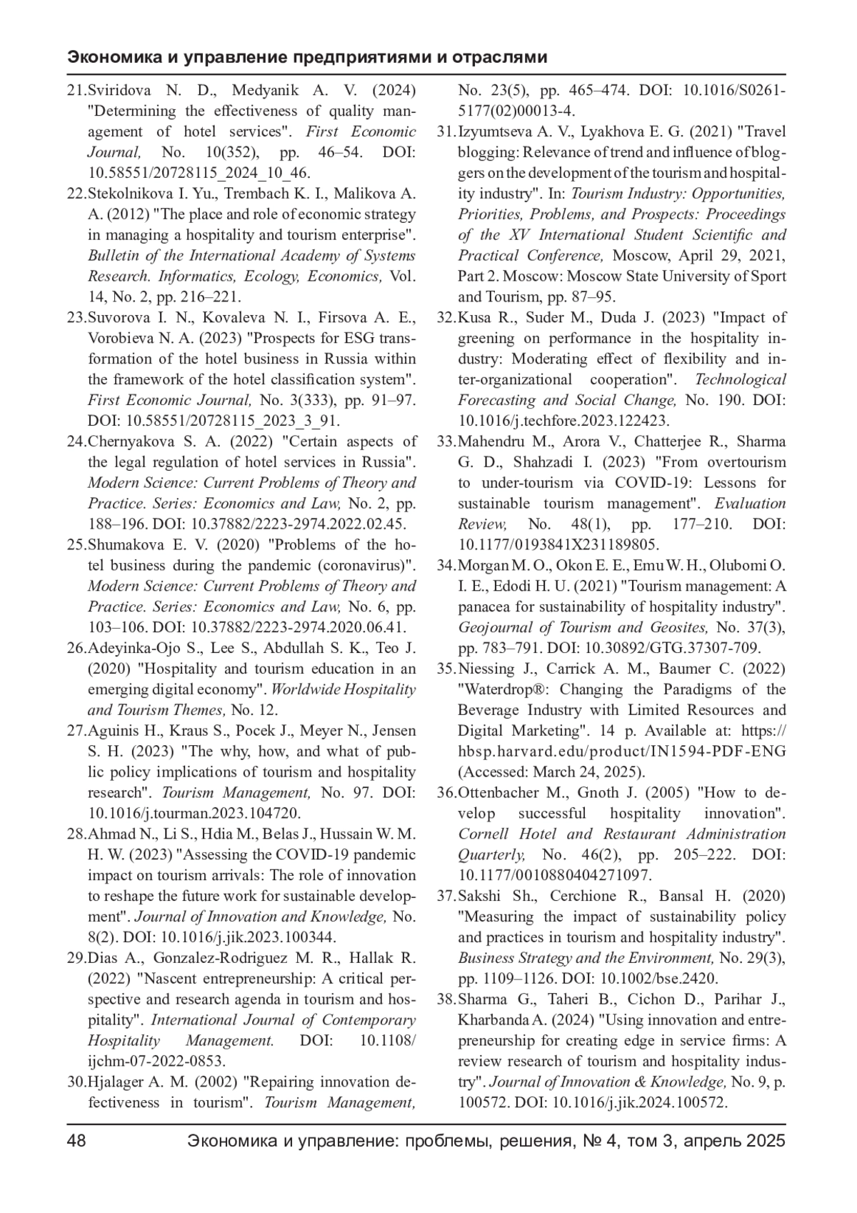 21. Свиридова Н. Д., Медяник А. В. Определение эффективности управления качеством гостиничных услуг // Первый экономический журнал. - 2024. - № 10(352). - С. 46-54. DOI: 10.58551/20728115_2024_10_46 EDN: EPXDLT