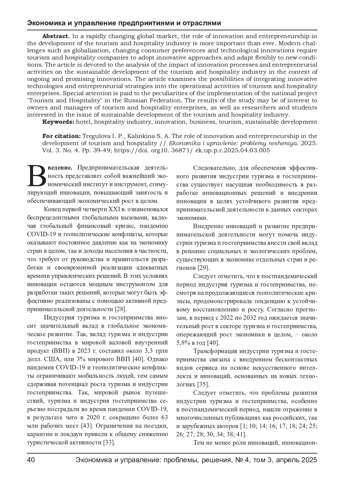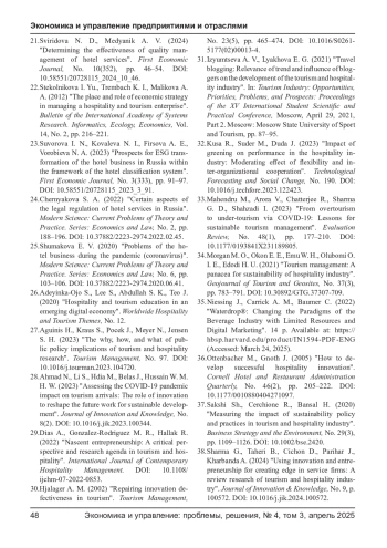 38. Sharma G., Taheri B., Cichon D., Parihar J., Kharbanda A. Using innovation and entrepreneurship for creating edge in service firms: A review research of tourism and hospitality industry // Journal of Innovation & Knowledge. - 2024. - №- P. 100572. DOI: 10.1016/j.jik.2024.100572 EDN: CRWRWL