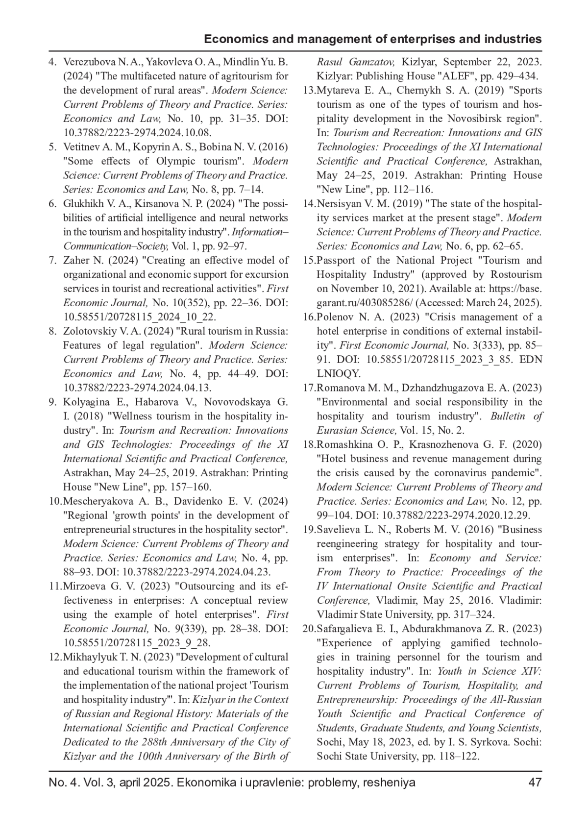 14. Нерсисян В. М. Состояние рынка оказания услуг гостеприимства на современном этапе // Современная наука: актуальные проблемы теории и практики. Серия: Экономика и право. - 2019. - № 6. - С. 62-65. EDN: LMYCZM