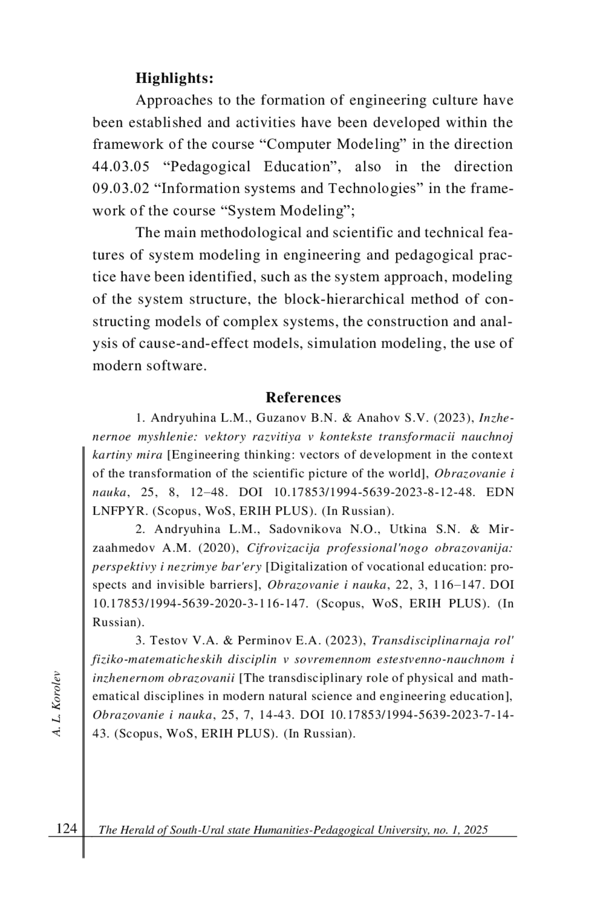 Заключение. Расширение кругозора и умений будущих учителей-предметников, углубление их знаний в области инженерной деятельности и моделирования гарантируют создание фундамента инженерной проектной деятельности школьников. Для эффективной работы по специальности будущему учителю необходимы знания во многих сферах практической деятельности, в том числе и в инженерной сфере. Это требует постоянного обновления содержания учебного курса «Компьютерное моделирование». Основные положения: - установлены подходы к формированию инженерной культуры и разработаны мероприятия в рамках курса «Компьютерное моделирование» по направлению 44.03.05 «Педагогическое образование», также по направлению 09.03.02 «Информационные системы и технологии» в рамках курса «Моделирование систем» с целью обновления содержания курсов; - определены основные методические и научно-технические особенности моделирования систем в инженерной и педагогической практике, такие как системный подход, моделирование структуры системы, блочно-иерархический метод построения моделей сложных систем, построение и анализ причинно-следственных и структурных моделей, имитационное моделирование, использование современного программного обеспечения.