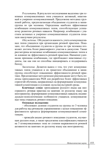 Заключение. Делается вывод о том, что учет коммуникативных типов учащихся и их грамотное объединение в мини-группы способствует повышению эффективности речевой практики. Предложенные методические рекомендации могут быть полезны преподавателям РКИ для разработки более эффективных стратегий обучения, направленных на формирование коммуникативной компетенции в условиях мультикультурной среды. Основные положения: - обосновано деление студентов на группы по 3 человека для работы над речевыми упражнениями с целью повышения эффективности процесса формирования коммуникативной компетенции; - проведён анализ речевого поведения студентов, изучающих русских язык, а также предложена классификация учащихся на 3 коммуникативных типа по степени выраженности речевой активности на занятиях по русскому языку как иностранному; - описаны все возможные комбинации учащихся, принадлежащих к выделенным коммуникативным типам, выделены наиболее удачные и неудачные сочетания, сформулированы методические рекомендации по организации студентов в группы с целью оптимизации работы над речевыми упражнениями на занятиях в условиях русской языковой среды.
