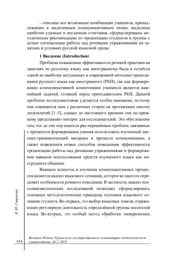 Введение. Проблема повышения эффективности речевой практики на занятиях по русскому языку как иностранному (РКИ) остается одной из наиболее актуальных в современной методике преподавания. Формирование коммуникативной компетенции учащихся является ключевой задачей, требующей учета не только лингвистических, но и культурных, психологических и когнитивных аспектов. В статье рассматриваются вопросы оптимизации речевой практики через анализ языкового сознания и коммуникативных типов учащихся, что позволяет разработать более эффективные методики обучения.