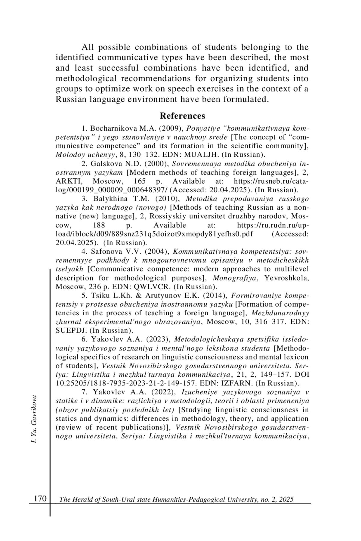 6. Яковлев А. А. Методологическая специфика исследований языкового сознания и ментального лексикона студента // Вестник Новосибирского государственного университета. Серия: Лингвистика и межкультурная коммуникация. 2023. Т. 21, № 2. С. 149-157. DOI: 10.25205/1818-7935-2023-21-2-149-157 EDN: IZFARN