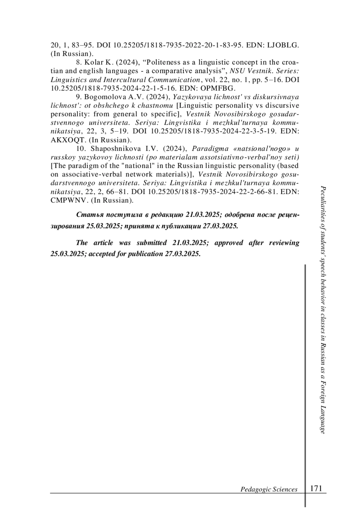 8. Kolar K. (2024), “Politeness as a linguistic concept in the croatian and english languages - a comparative analysis”, NSU Vestnik. Series: Linguistics and Intercultural Communication, vol. 22, no. 1, pp. 5-16. DOI: 10.25205/1818-7935-2024-22-1-5-16 EDN: OPMFBG личность: от общего к частному // Вестник Новосибирского государственного университета. Серия: Лингвистика и межкультурная коммуникация. 2024. Т. 22, № 3. С. 5-19. DOI: 10.25205/1818-7935-2024-22-3-5-19 EDN: AKXOQT