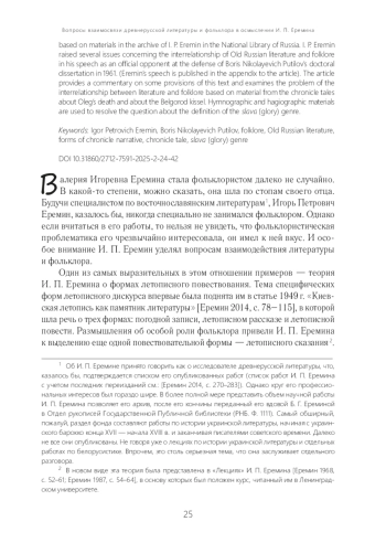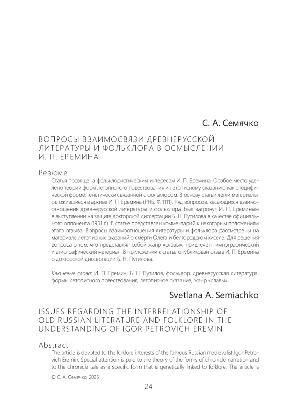 Статья: ВОПРОСЫ ВЗАИМОСВЯЗИ ДРЕВНЕРУССКОЙ ЛИТЕРАТУРЫ И ФОЛЬКЛОРА В ОСМЫСЛЕНИИ И. П. ЕРЕМИНА (2025)