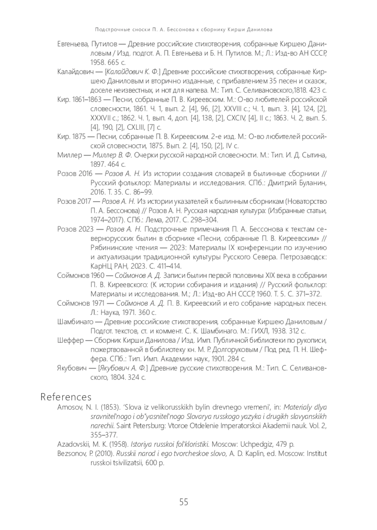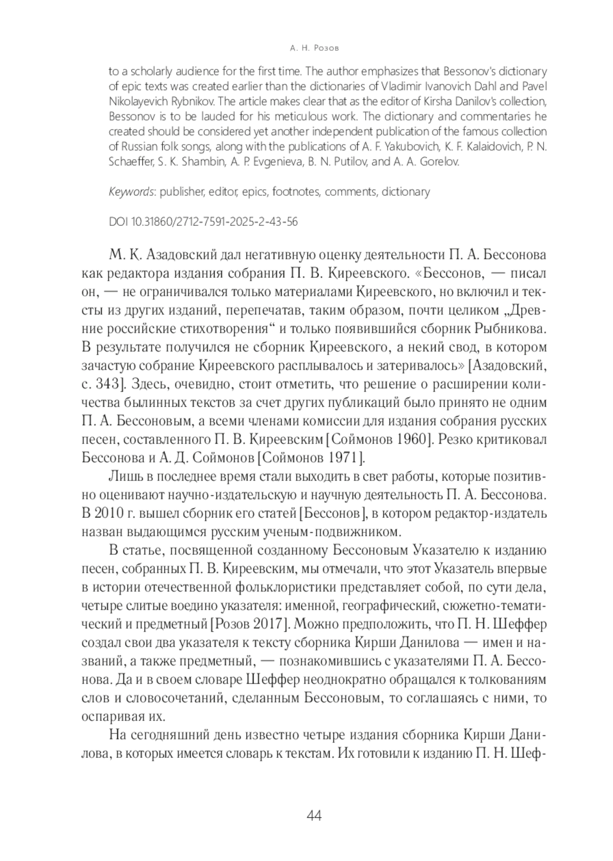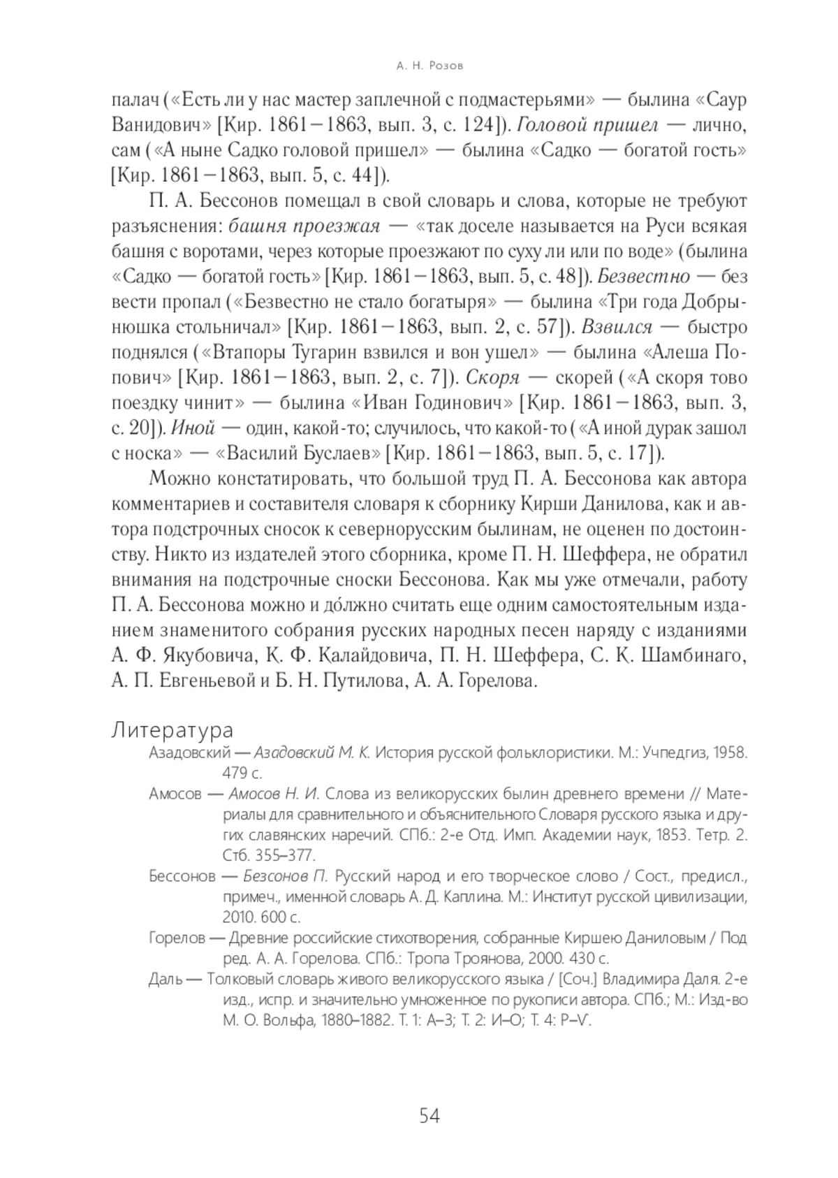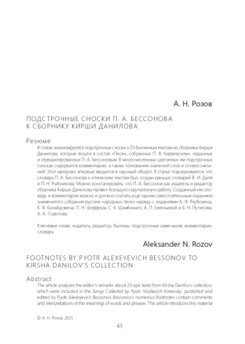 РОЗОВ А. Н. ПОДСТРОЧНЫЕ СНОСКИ П. А. БЕССОНОВА К СБОРНИКУ КИРШИ ДАНИЛОВА // СЛОВЕСНОСТЬ И ИСТОРИЯ. 2025. № 2