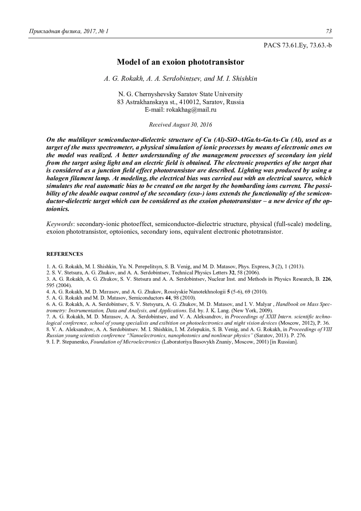 Роках А. Г., Сердобинцев А. А., Шишкин М. И. Модель экзоионного фототранзистора 70