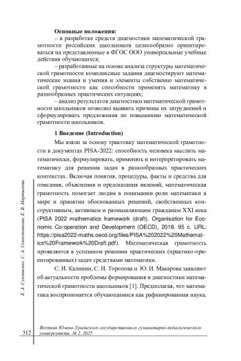 Заключение. Для эффективного формирования математической грамотности необходимо учитывать полученные результаты диагностики и организовать на уроках математики деятельность учащихся, способствующую формированию умений учитывать контекст, выявлять дефициты информации, необходимой для решения задачи, и аргументировать свою позицию. При этом основой для формирования математической грамотности обучающихся является хороший уровень освоения ими программного материала по математике. Необходимо обучение действующих и будущих учителей математики методике развития универсальных учебных действий, связанных с формированием математической грамотности, и обеспечение их соответствующими дидактическими средствами. Основные положения: - в разработке средств диагностики математической грамотности российских школьников целесообразно ориентироваться на представленные в ФГОС ООО универсальные учебные действия обучающихся; - разработанные на основе анализа структуры математической грамотности комплексные задания диагностируют математические знания и умения и элементы собственно математической грамотности как способности применять математику в разнообразных практических ситуациях; - анализ результатов диагностики математической грамотности школьников позволил выявить причины их затруднений и сформулировать предложения по повышению математической грамотности школьников.