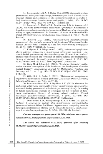 20. Перевощикова Е. Н., Бычков А. В. Освоение будущими учителями математики приемов формирования функциональной математической грамотности учащихся основной школы 2// Вестник Вятского государственного университета. 2022. № 4 (146). С. 133-140. DOI: 10.25730/VSU.7606.22.062 EDN: QSCVLC
