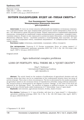 33. Тарханов О. В. Агрохимия не совместима с жизнью // Экономика и управление: проблемы, решения. - 2025. - Т. 1(156). - С. 135-144. EDN: KPZRRY