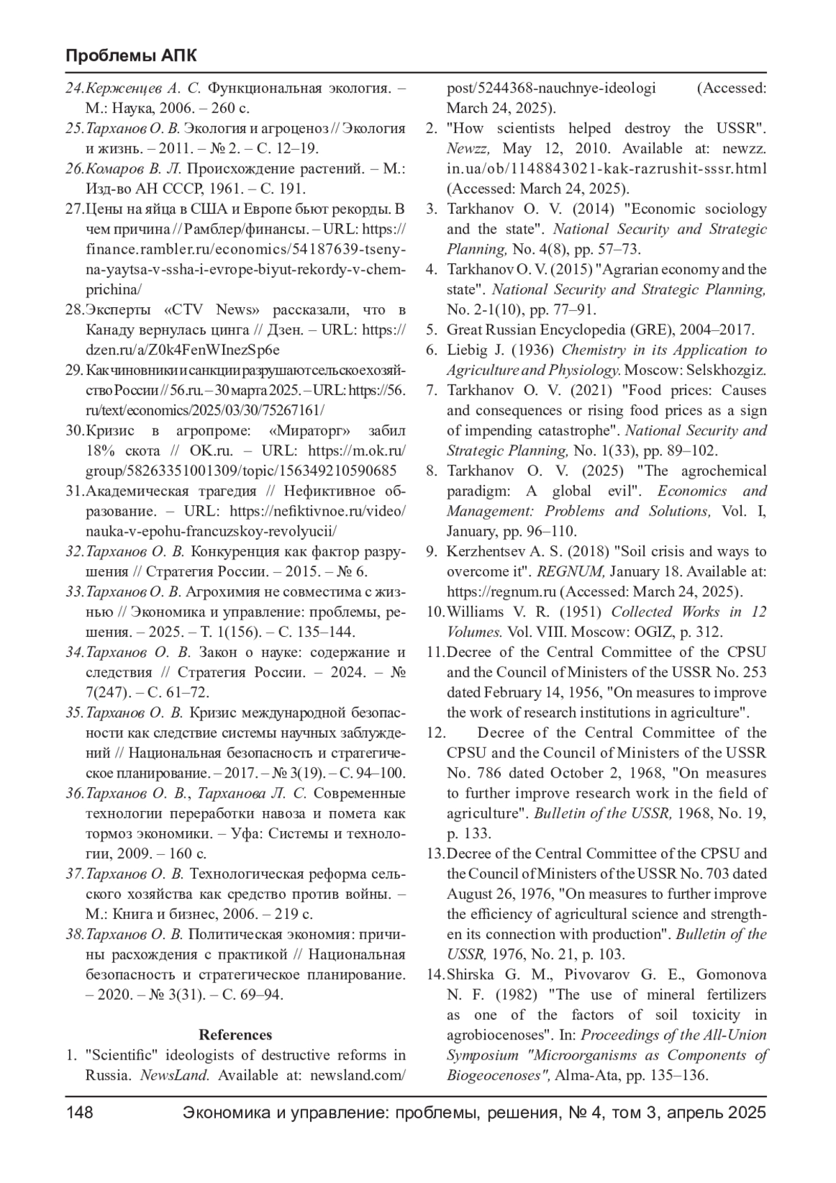 8. Тарханов О. В. Агрохимическая парадигма: как мировое зло // Экономика и управление: проблемы, решения. - 2025. - Т. 1. - С. 96-110. EDN: OYFLCG