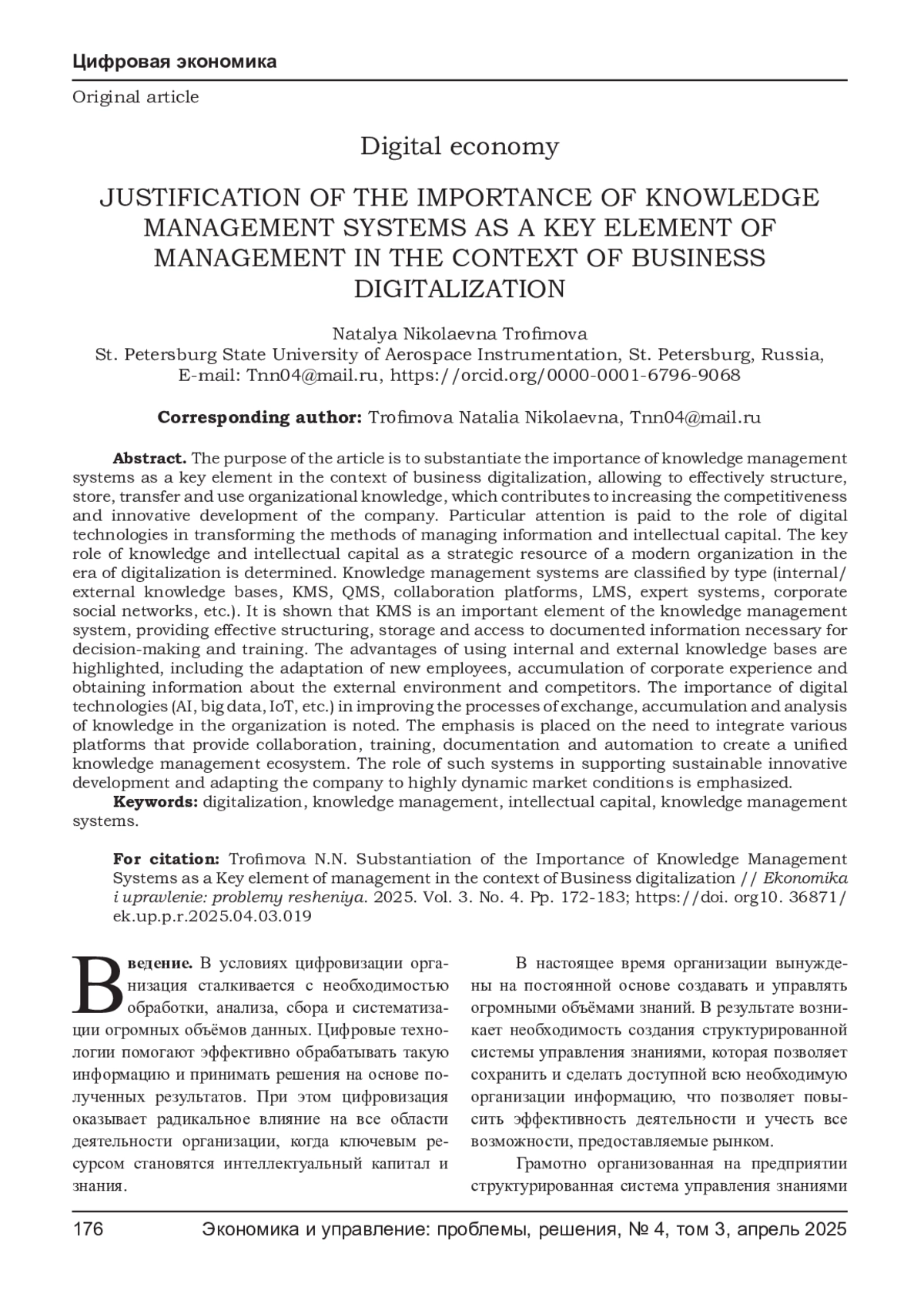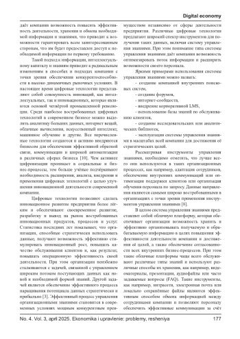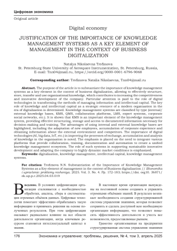 Целью статьи является обоснование значимости систем управления знаниями как ключевого элемента в условиях цифровизации бизнеса, позволяющего эффективно структурировать, сохранять, передавать и использовать организационные знания, что способствует повышению конкурентоспособности и инновационного развития компании. Особое внимание уделяется роли цифровых технологий в трансформации способов управления информацией и интеллектуальным капиталом. Определена ключевая роль знаний и интеллектуального капитала как стратегического ресурса современной организации в эпоху цифровизации. Системы управления знаниями классифицированы по типам (внутренние/внешние базы знаний, СУД, СУК, платформы для совместной работы, LMS, экспертные системы, корпоративные соцсети и др.). Показано, что СУД - важный элемент системы управления знаниями, обеспечивающий эффективную структуризацию, хранение и доступ к документированной информации, необходимой для принятия решений и обучения. Выделены преимущества использования внутренних и внешних баз знаний, включая адаптацию новых сотрудников, накопление корпоративного опыта и получение информации о внешней среде и конкурентах. Отмечено значение цифровых технологий (AI, big data, IoT и др.) в улучшении процессов обмена, накопления и анализа знаний в организации. Сделан акцент на необходимости интеграции различных платформ, обеспечивающих совместную работу, обучение, документирование и автоматизацию, для создания единой экосистемы управления знаниями. Подчёркнута роль таких систем в поддержании устойчивого инновационного развития и адаптации компании к высокодинамичным условиям рынка.