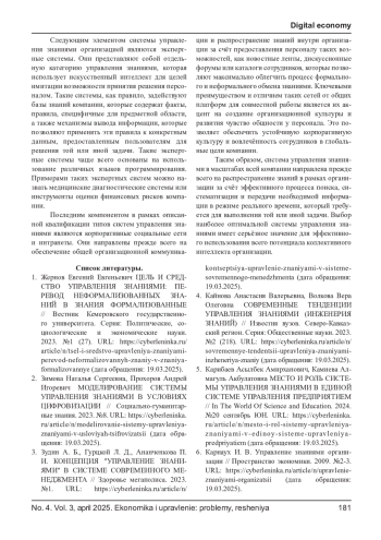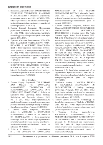 6. Карнаух И. В. Управление знаниями организации // Пространство экономики. 2009. №2-3. URL: https://cyberleninka.ru/article/n/upravlenieznaniyami-organizatsii (дата обращения: 19.03.2025).
