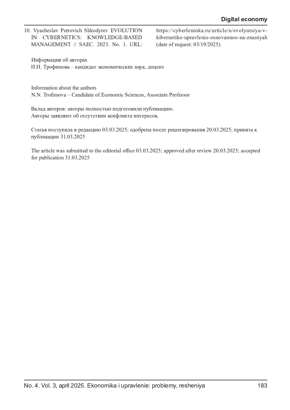 10. Шкодырев Вячеслав Петрович ЭВОЛЮЦИЯ В КИБЕРНЕТИКЕ: УПРАВЛЕНИЕ, ОСНОВАННОЕ НА ЗНАНИЯХ // SAEC. 2023. №1. URL: https://cyberleninka.ru/article/n/evolyutsiya-vkibernetike-upravlenie-osnovannoe-na-znaniyah (дата обращения: 19.03.2025).
