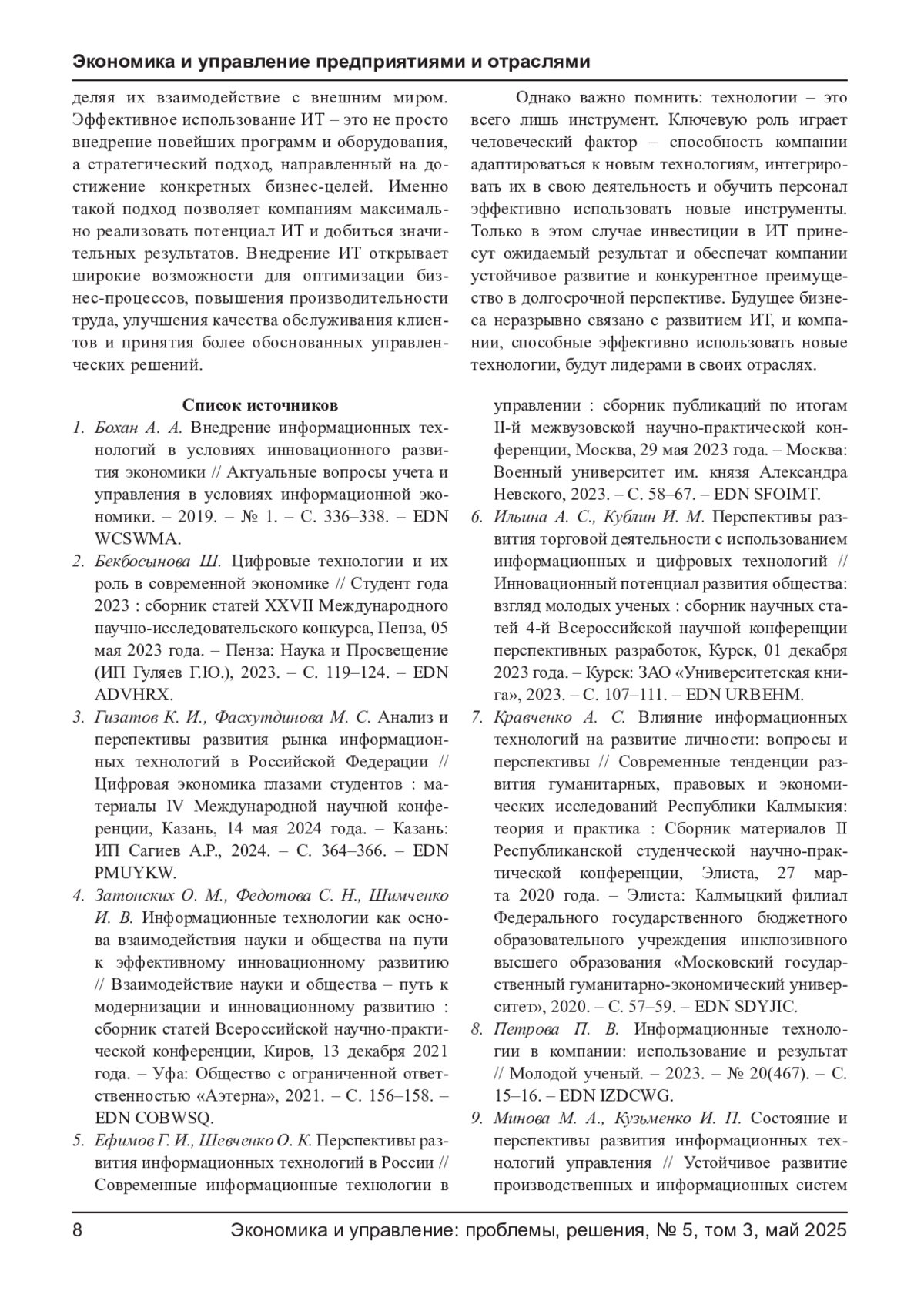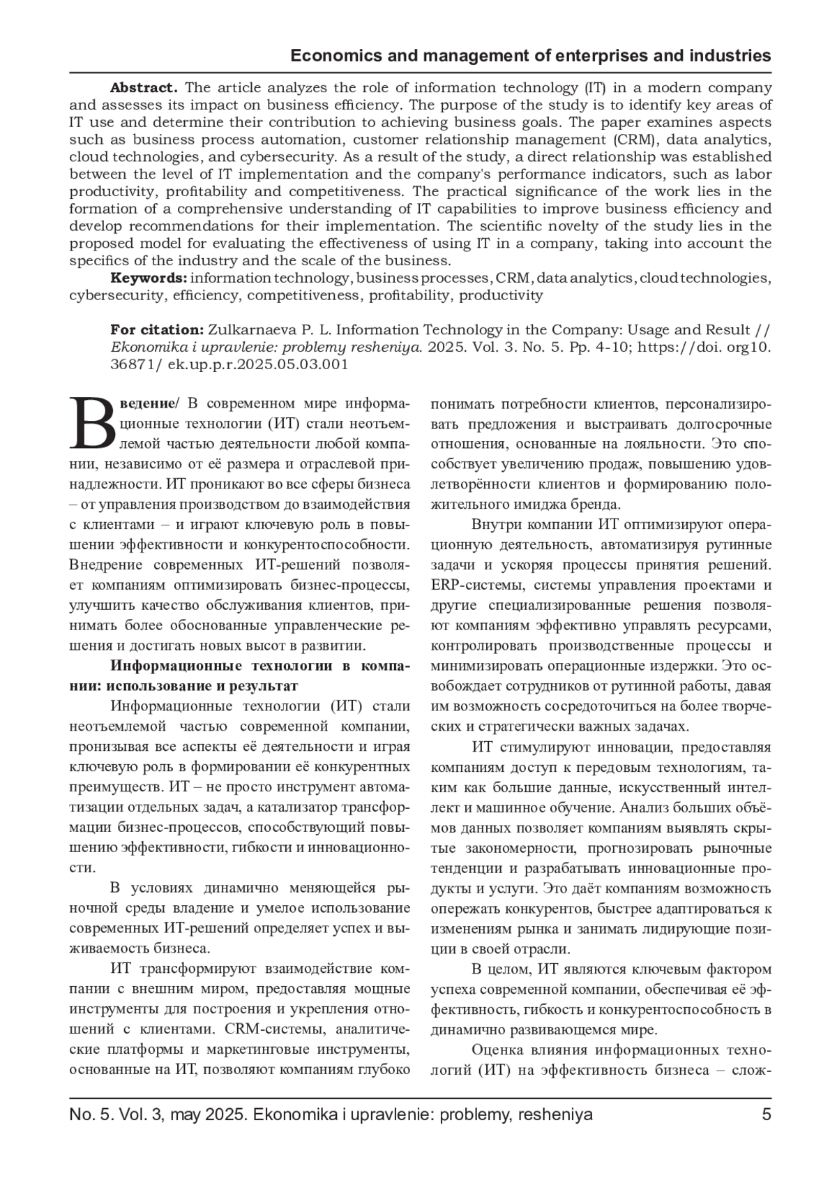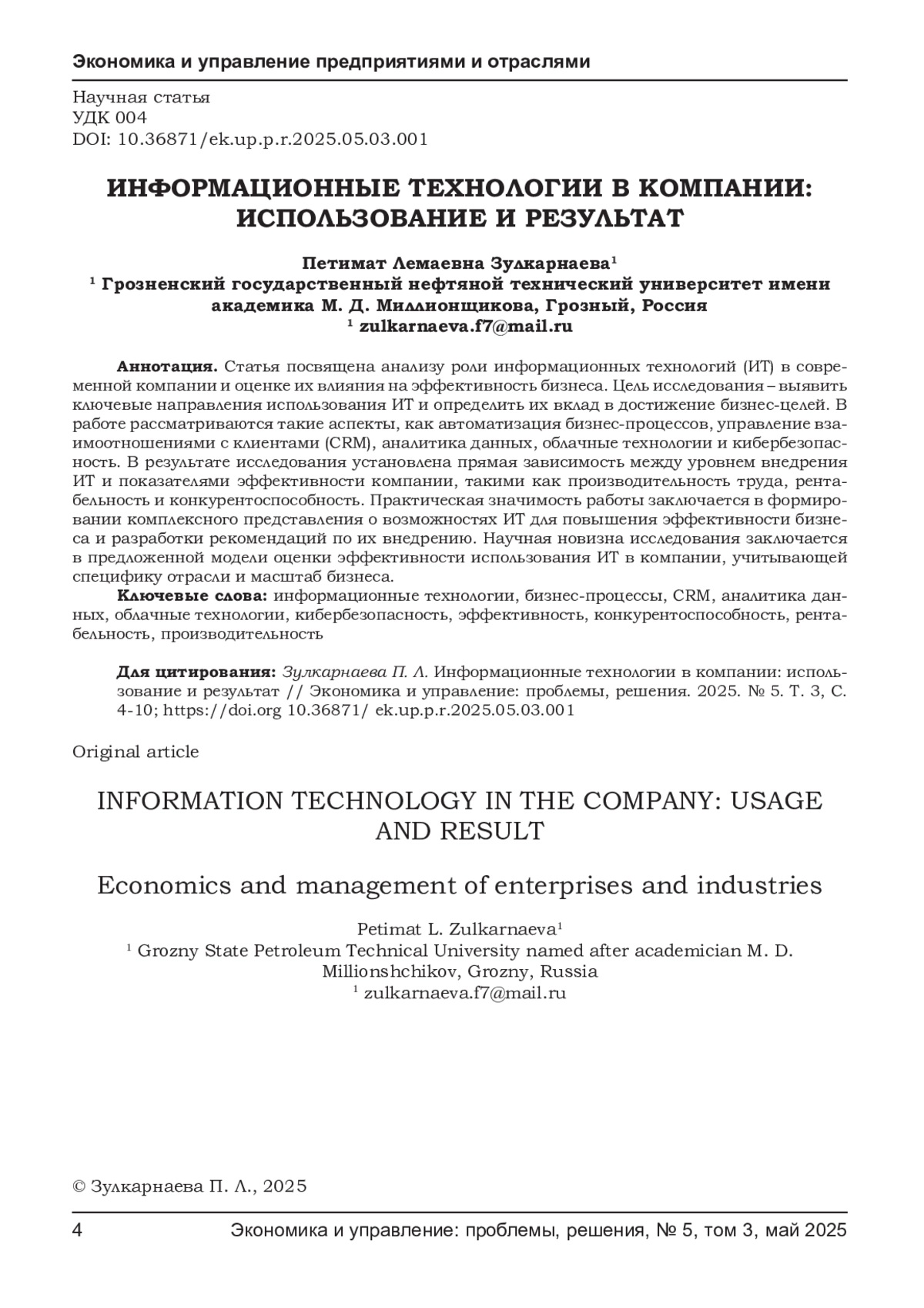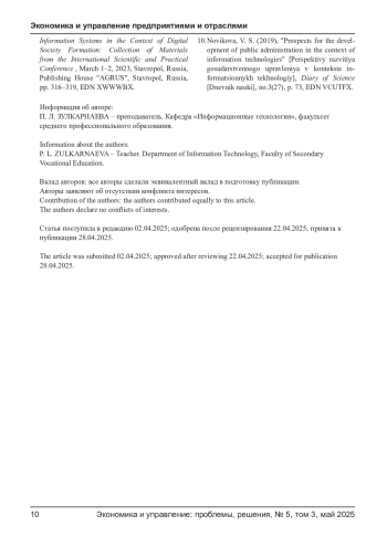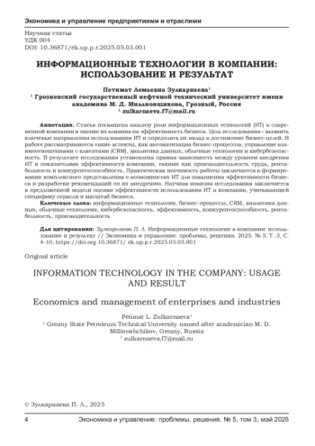 ЗУЛКАРНАЕВА П. Л. ИНФОРМАЦИОННЫЕ ТЕХНОЛОГИИ В КОМПАНИИ: ИСПОЛЬЗОВАНИЕ И РЕЗУЛЬТАТ // ЭКОНОМИКА И УПРАВЛЕНИЕ: ПРОБЛЕМЫ, РЕШЕНИЯ. 2025. ТОМ 3 № 5