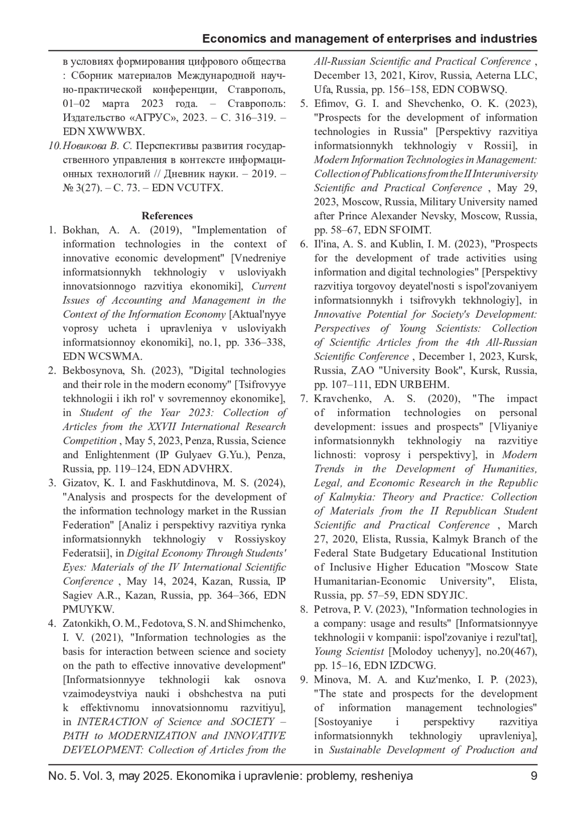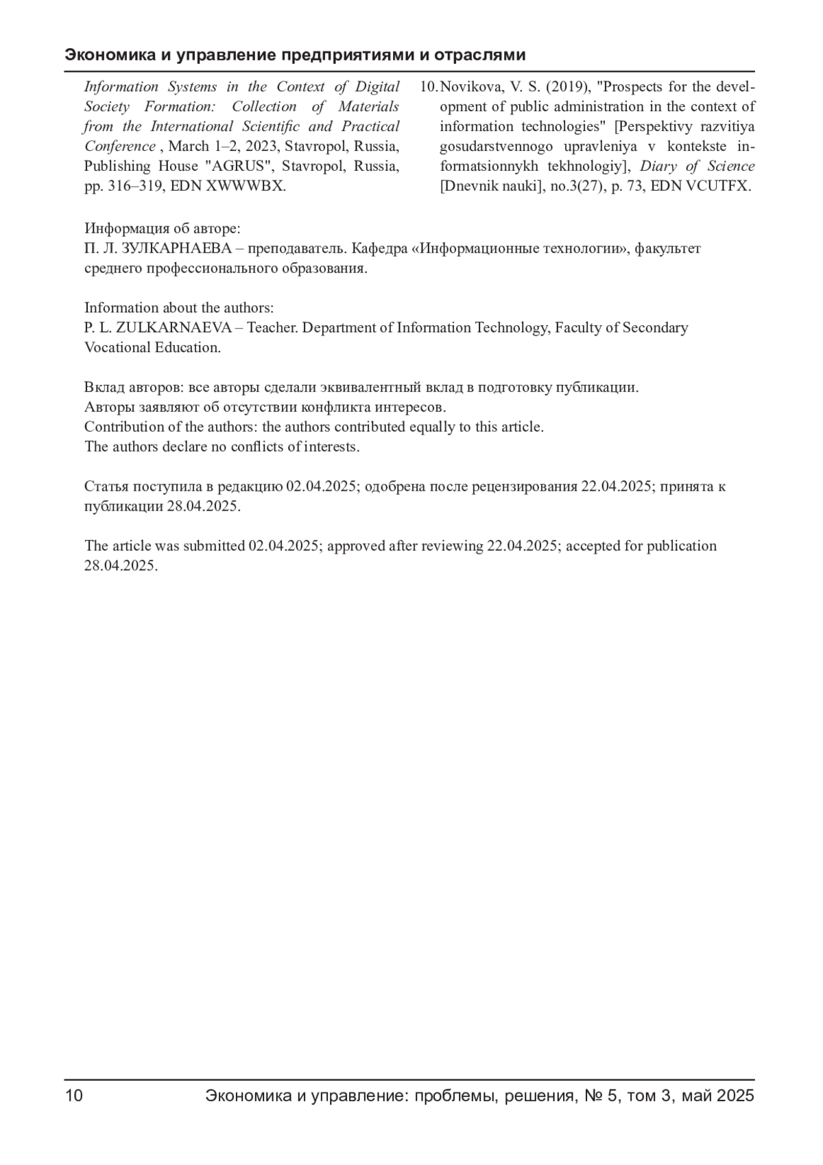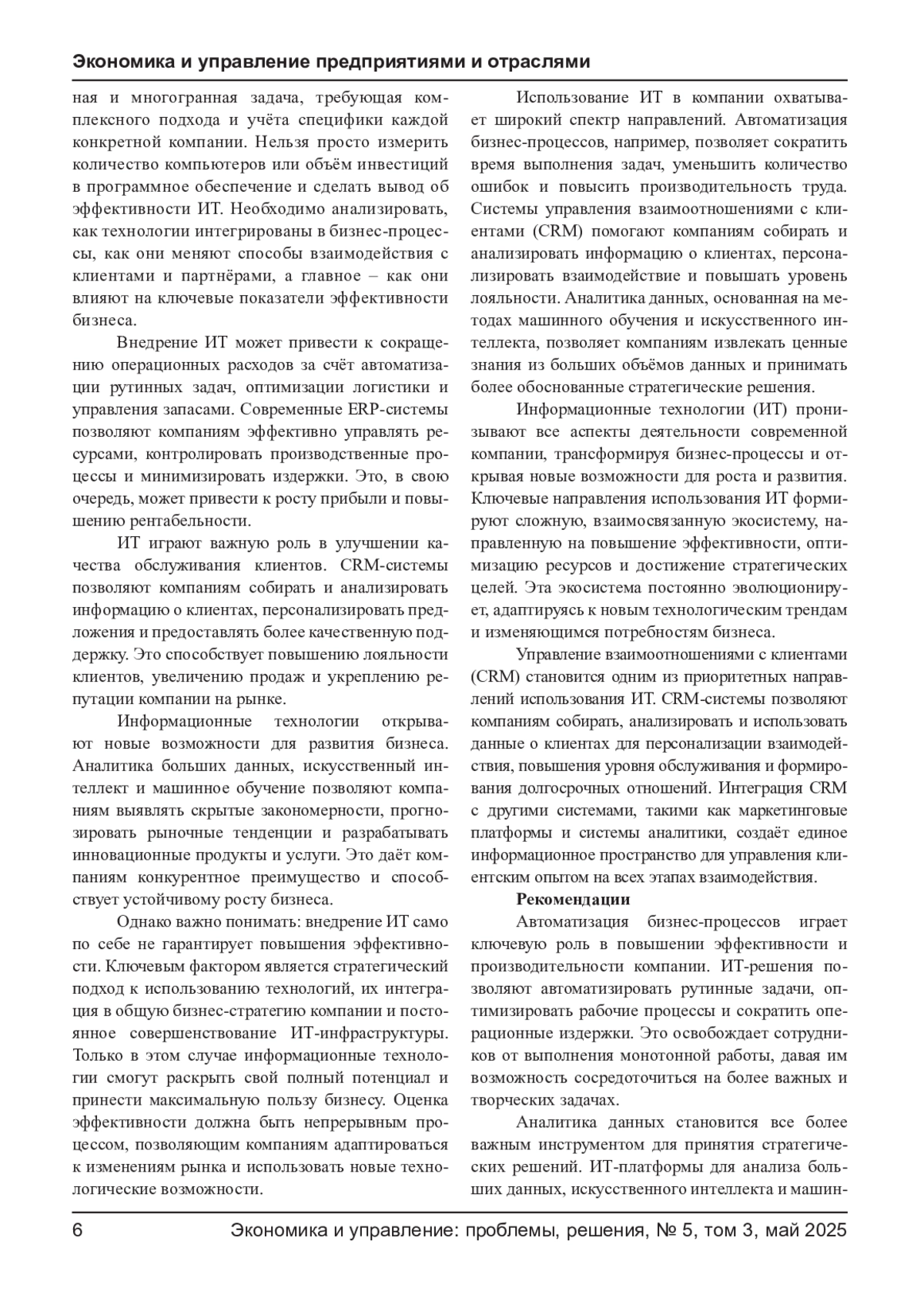 ЗУЛКАРНАЕВА П. Л. ИНФОРМАЦИОННЫЕ ТЕХНОЛОГИИ В КОМПАНИИ: ИСПОЛЬЗОВАНИЕ И РЕЗУЛЬТАТ // ЭКОНОМИКА И УПРАВЛЕНИЕ: ПРОБЛЕМЫ, РЕШЕНИЯ. 2025. ТОМ 3 № 5