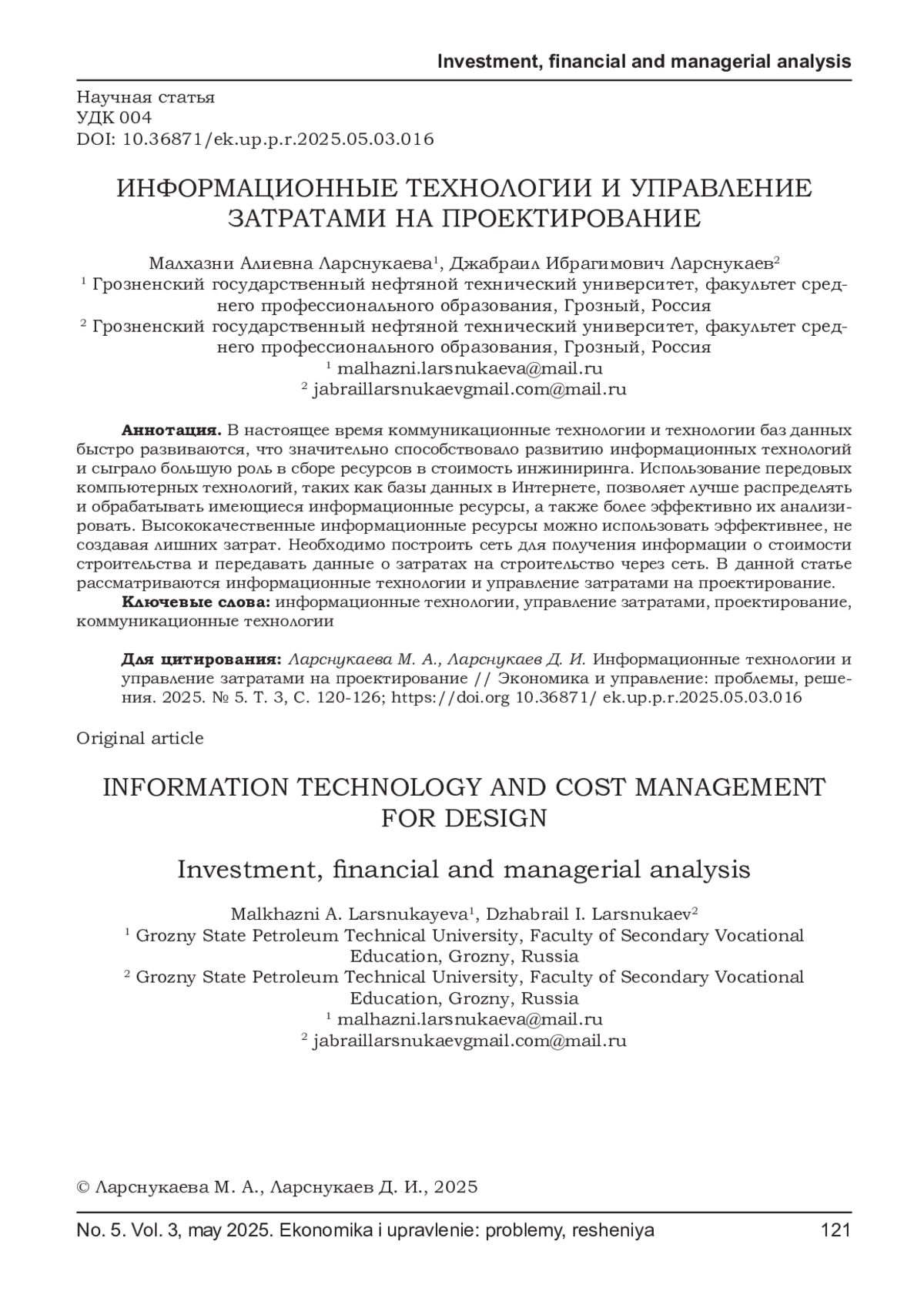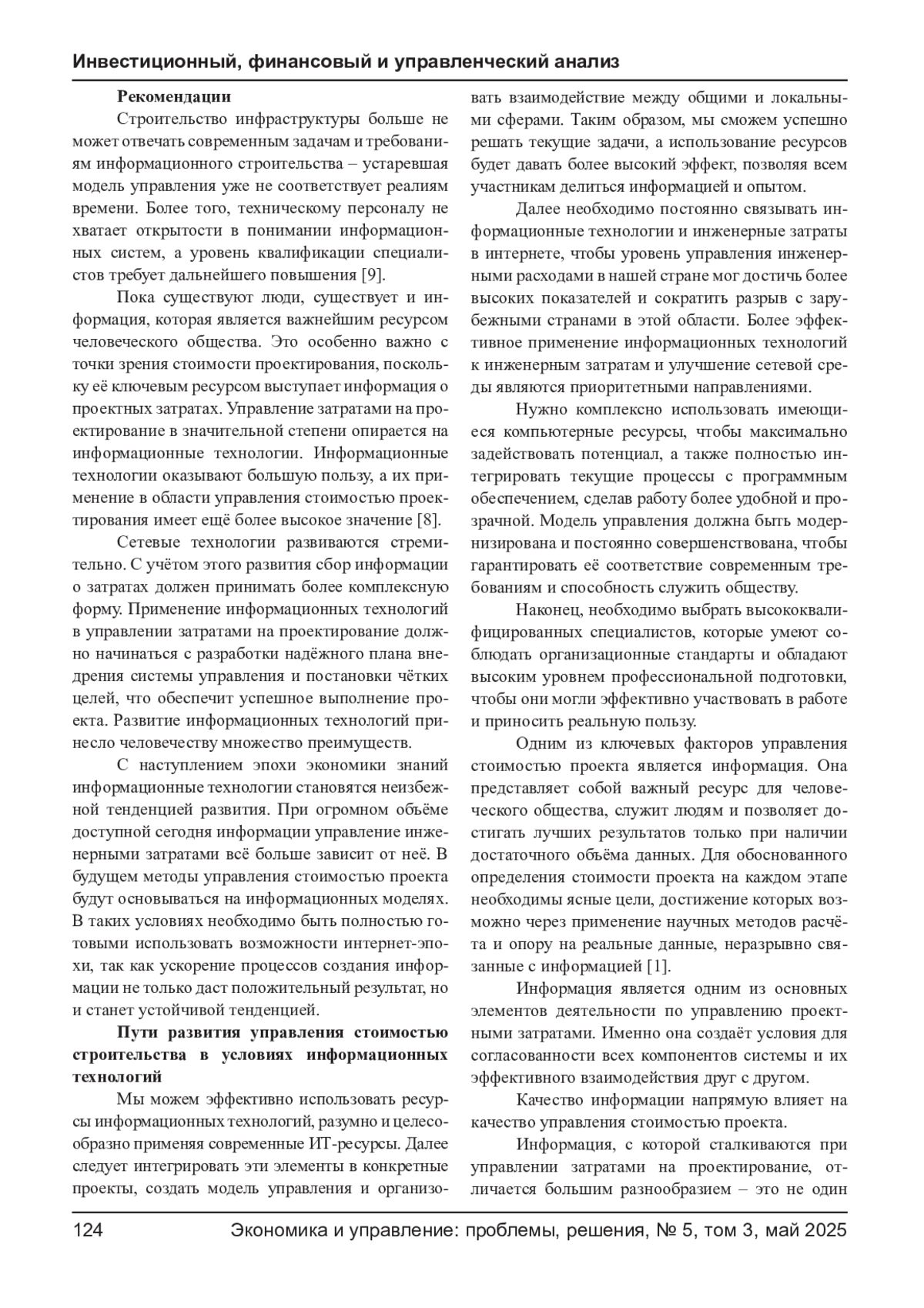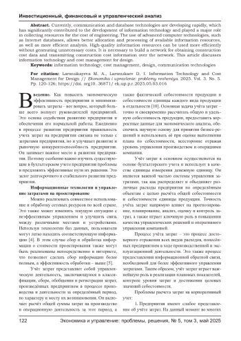 В настоящее время коммуникационные технологии и технологии баз данных быстро развиваются, что значительно способствовало развитию информационных технологий и сыграло большую роль в сборе ресурсов в стоимость инжиниринга. Использование передовых компьютерных технологий, таких как базы данных в Интернете, позволяет лучше распределять и обрабатывать имеющиеся информационные ресурсы, а также более эффективно их анализировать. Высококачественные информационные ресурсы можно использовать эффективнее, не создавая лишних затрат. Необходимо построить сеть для получения информации о стоимости строительства и передавать данные о затратах на строительство через сеть. В данной статье рассматриваются информационные технологии и управление затратами на проектирование.