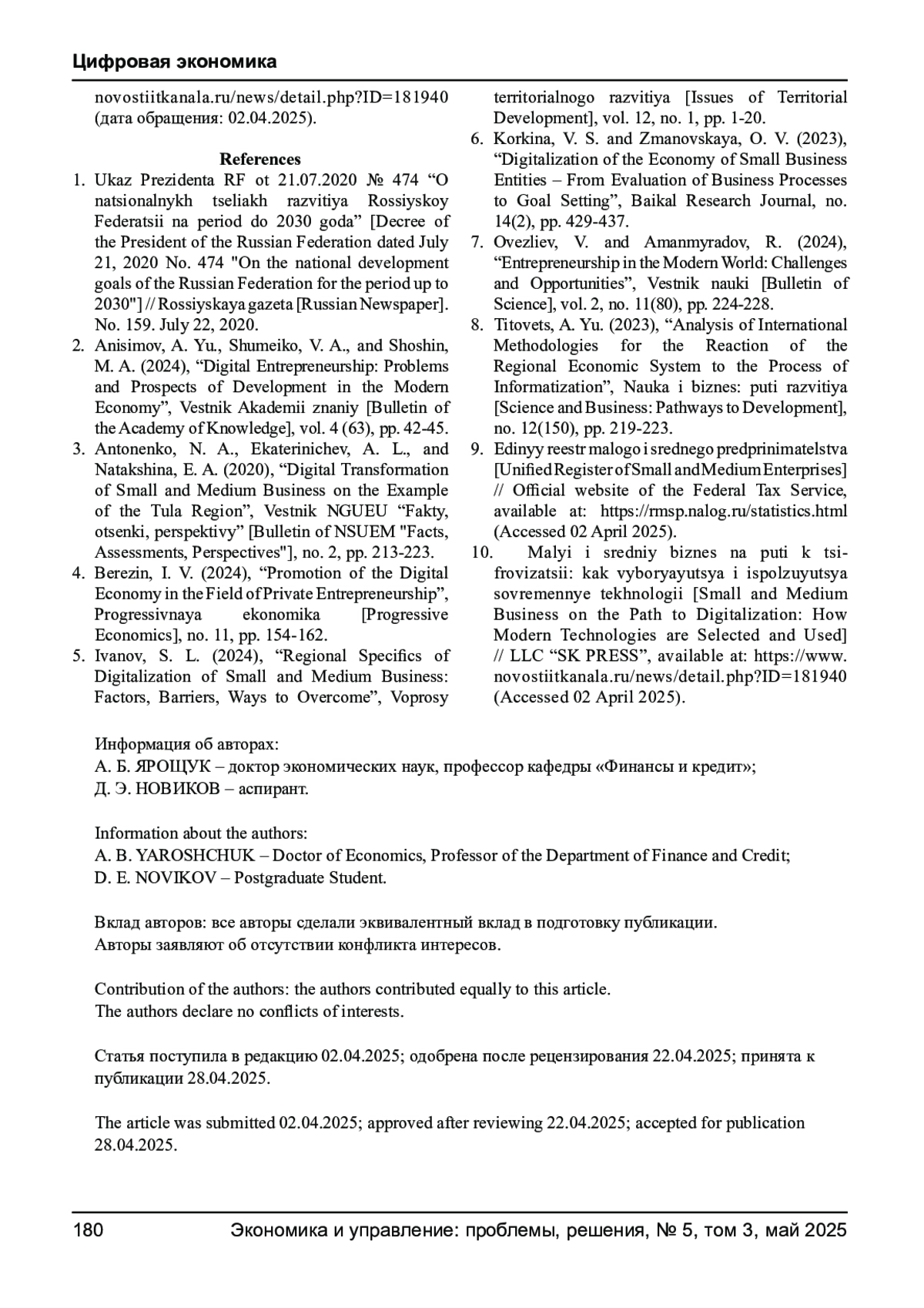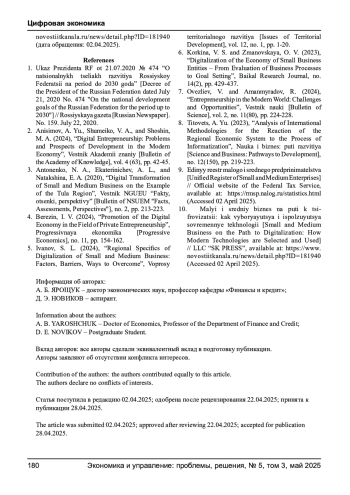 6. Коркина В. С., Змановская О. В. Цифровизация экономики субъектов малого предпринимательства - от оценки бизнес-процессов к целеполаганию // Baikal Research Journal. - 2023. - № 14 (2). - С. 429-437. EDN: TSSXOA