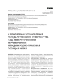 ВВЕДЕНИЕ. Антарктический регион является уникальным с точки зрения организации эффективного управления одновременно большим числом государств. Для этой цели в 1959 г. был заключен Договор об Антарктике, который позволил предотвратить возникновение конфликтов. Тем не менее не так давно стала активна обсуждаться концепция территориального деления данного региона. Китай, являясь одной из наиболее быстроразвивающихся с экономической точки зрения государств, что влечет за собой заинтересованность в усилении влияния в Антарктическом регионе, также активно участвует в разрешении вопросов, связанных с правовым регулированием Антарктики. Цель статьи – определить позицию Китая в отношении деятельности в Антарктическом регионе в целом, а также, с точки зрения установления государственного суверенитета над территориями Антарктики.