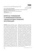 РЕЗУЛЬТАТЫ ИССЛЕДОВАНИЯ. В статье представлен обзор исследований термина «легитимация» в международном праве, излагаются различные подходы к определению и толкованию этого понятия, раскрываются содержание и структурные элементы процесса международно-правовой легитимации, направленного на достижение, признание или подтверждение легитимности какой-либо международно-правовой позиции государства. Формируя собственное видение понятия «международно-правовая легитимация», автор разработала ряд классификаций (структурных схем): типология подходов к определению понятия «легитимация» (нигилистический, идеалистический и компромиссный), структура процесса международно-правовой легитимации, виды международно-правовой легитимации по временному критерию и по критерию наличия воли.
