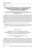 Настоящее исследование посвящено анализу влияния цифровизации на структурные изменения российского рынка труда в условиях технологической трансформации экономики. Рассматриваются ключевые тенденции цифровой трансформации отраслей, формирование новых профессиональных компетенций и изменение требований к квалификации работников. На основе статистических данных и экономических показателей проанализированы структурные сдвиги в занятости населения, выявлены отрасли с наибольшим потенциалом цифровизации и сопутствующие риски технологической безработицы. Исследование демонстрирует неравномерность цифровой трансформации в различных секторах российской экономики и региональные диспропорции в адаптации к новым технологическим условиям. Предложены рекомендации по совершенствованию государственной политики в сфере регулирования рынка труда и развития человеческого капитала в условиях цифровой экономики.