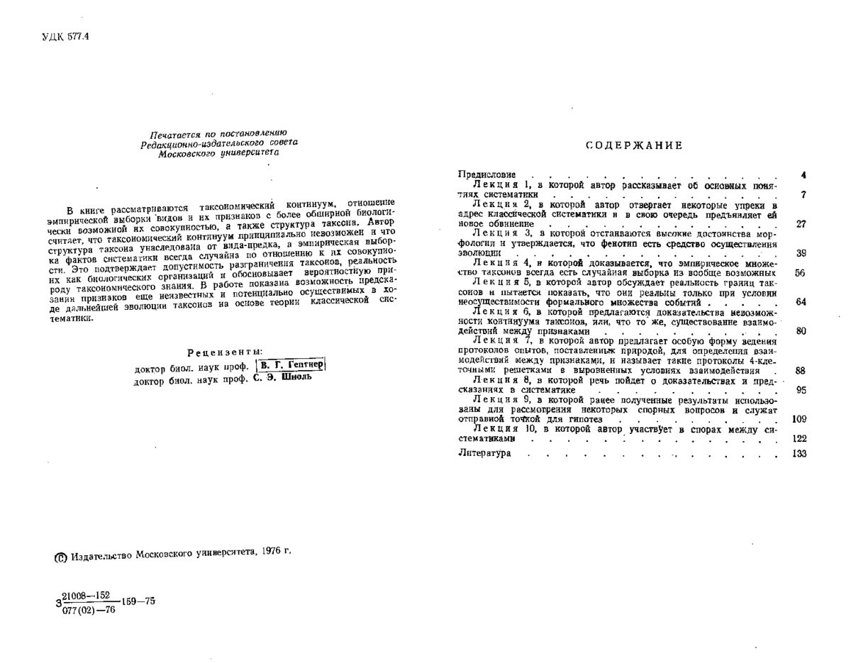 В книге рассматриваются таксономический континуум, отношение эмпирической выборки видов и их признаков с более обширной биологически возможной их совокупностью, а также структура таксона. Автор считает, что таксономический континуум принципиально невозможен и что структура таксона унаследована от вида-предка, а эмпирическая выборка фактов систематики всегда случайна по отношению к их совокупности. Это подтверждает допустимость разграничения таксонов, реальность их как биологических организаций и обосновывает вероятностную природу таксономического знания. В работе показана возможность предсказания признаков еще неизвестных и потенциально осуществимых в ходе дальнейшей эволюции таксонов на основе теории классической систематики.