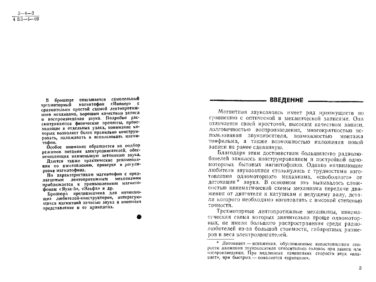 В брошюре описы вается самодельный трехмоторный магнитофон «Пионер» с сравнительно простой схемой лентопротяжного механизма, хорошим качеством записи и воспроизведения звука. Подробно рассматриваются физические процессы, происходящие в отдельных узлах, понимание которых позволяет более правильно конструировать, налаживать и использовать магнитофон. Особое внимание обращается на подбор режимов питания электродвигателей, обеспечивающих наименьшую детонацию звука. Даются также практические рекомендации по изготовлению, проверке и регулировке магнитофона. По характеристикам магнитофон с предлагаемым лентопротяжным механизмом приближается к промышленным магнитофонам «Яуза-5», «Эльфа» и др. Брошюра предназначена для начинающих любителей-конструкторов, интересующихся магнитной записью звука и имеющих представление о ее принципах.
