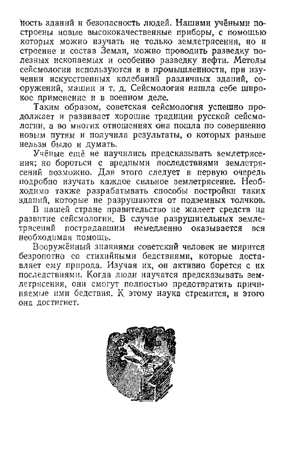 Сейсмология — наука о землетрясениях. С самого начала русская сейсмология шла в первых рядах мировой науки. За годы советской власти сейсмология в нашей стране получила очень широкое развитие. Подробно изучено много землетрясений, изобретено и построено большое количество новых приборов, учёные научились с помощью методов сейсмологии разыскивать полезные ископаемые. Теперь хорошо известно, что основная часть всех землетрясений СССР относится к землетрясениям тектоническим. Известно, какие именно тектонические нарушения особенно опасны, где они находятся и какой силы землетрясения они могут дать. Составлены специальные карты сейсмического районирования, на которых показаны опасные районы с указанием силы будущих землетрясений.