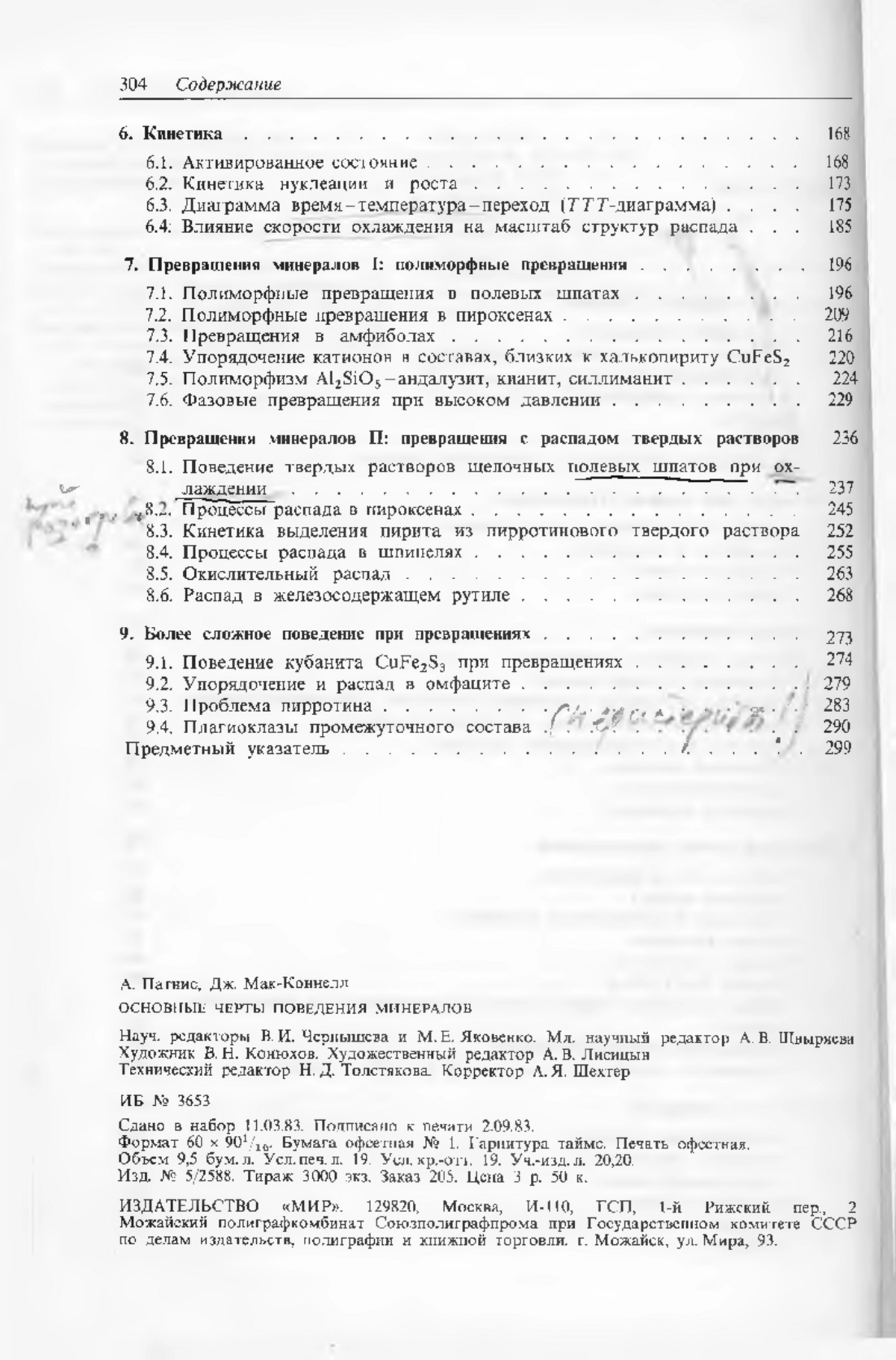В книге преподавателей Кембриджского университета (Великобритания) А. Патниса и Дж. Мак-Коннелла с позиций кристаллографии, термодинамики и кинетики рассматриваются процессы, происходящие в минералах с момента их образования и в ходе последующего падения температуры (полиморфизм, порядок-беспорядок, твердые растворы и т.д.). Этот подход к изучению минералов является новым и не встречается в других, как отечественных, так и зарубежных, книгах по минералогии.